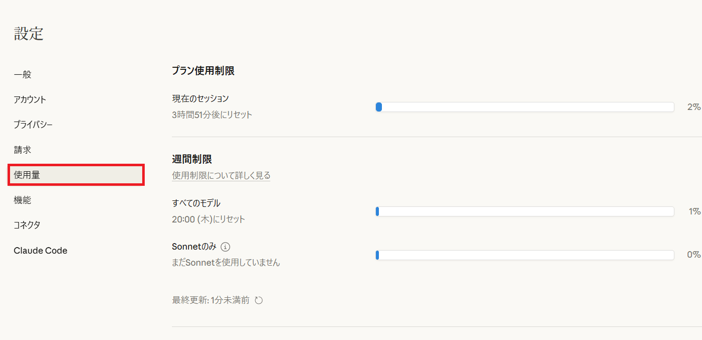 また週単位での総利用量にも上限があるため、週の前半にフルスロットルで使いすぎると週末に制限がかかりやすくなります。重要度の低い作業は自分で行うなど、AIに頼る場面の取捨選択が重要です。