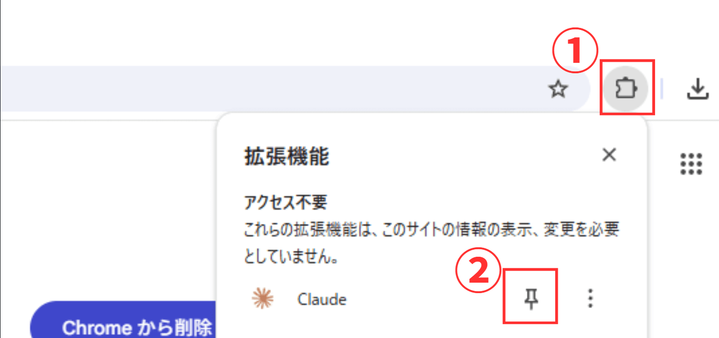 ブラウザ画面右上のパネルアイコンをクリックし、表示された「Claude」のピンアイコンをクリックします。