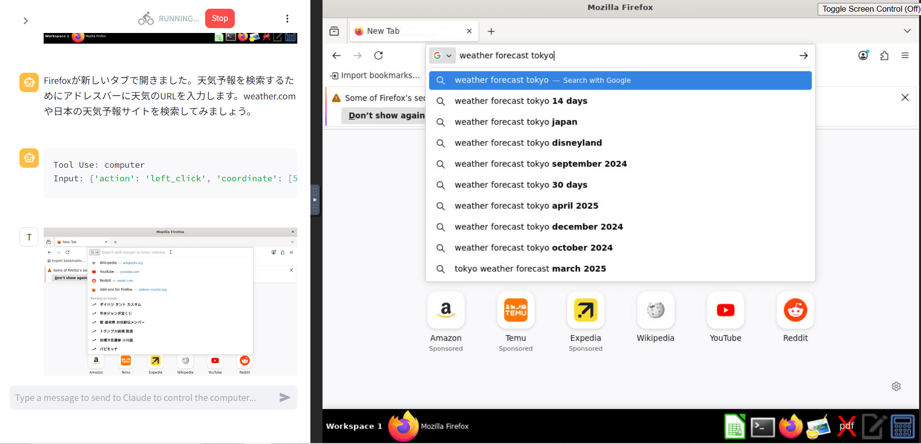 Claude computer useでは、「left_click (特定座標をクリック)」、「type (テキスト文字列を入力)」、「mouse_move (マウスを特定座標に移動)」等の基本的なアクションがサポートされます。そして、xdotool等の自動化ツールを使用して、各アクションを実際の処理としてプログラム内に実装します。