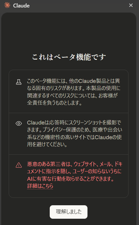 初回のみClaude in Chrome利用に関する注意事項が表示されるため、問題がなければ「理解しました」をクリックします。