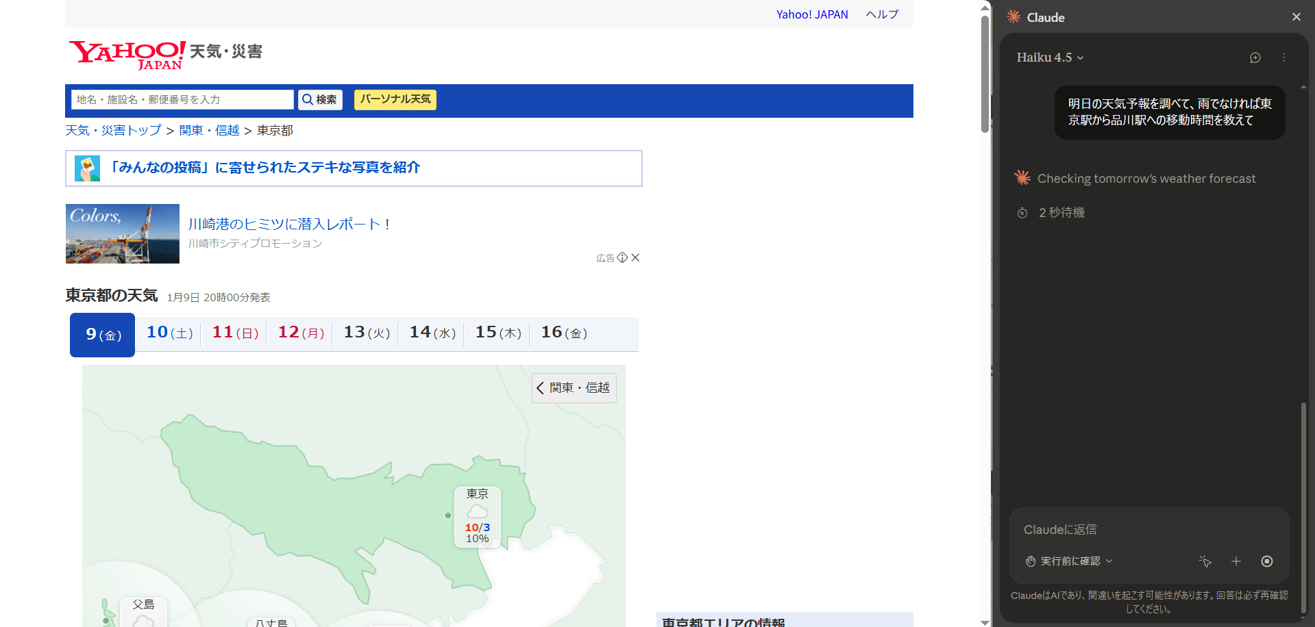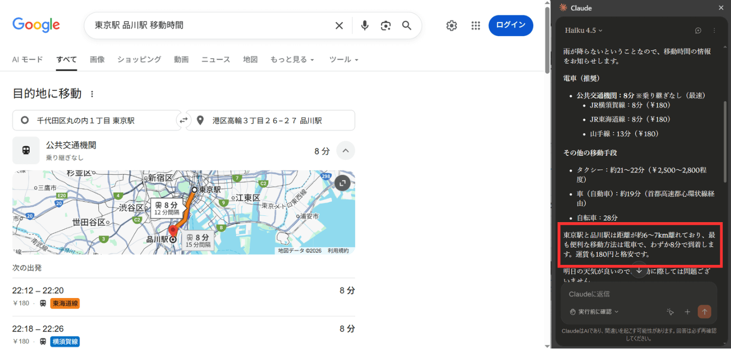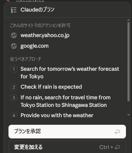 「明日の天気予報を調べて、雨でなければ東京駅から品川駅への移動時間を教えて」というプロンプトを入力した場合、以下のように動作しました。