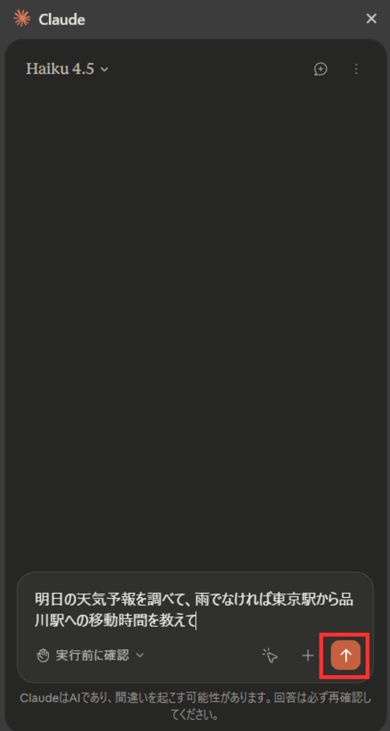 Claude in Chromeのチャット欄にプロンプトを入力し、「↑」アイコンをクリックします。