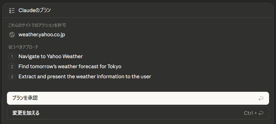 Claudeが作成したプランとして、アクセス先のサイト・サイトで実行するアクションが提示されます。「プランを承認」をクリックすると、自動操作を開始します。