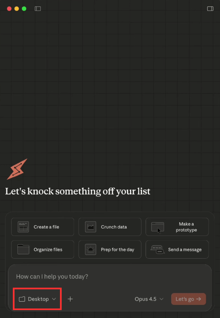 Claude Desktopアプリを起動し、チャット欄左下のボタンでClaude Coworkの作業用フォルダを選択します。