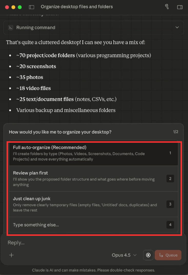 例えば、「Please help organize my desktop(デスクトップの整理を手伝ってください)」という指示を入力します。