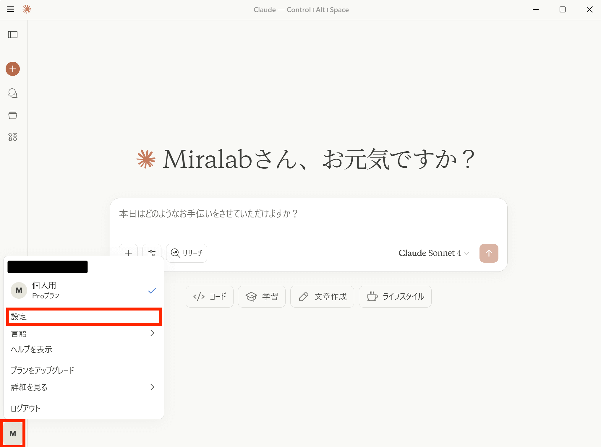 Claude Desktopはショートカットキーを登録することにより、簡単に起動できます。