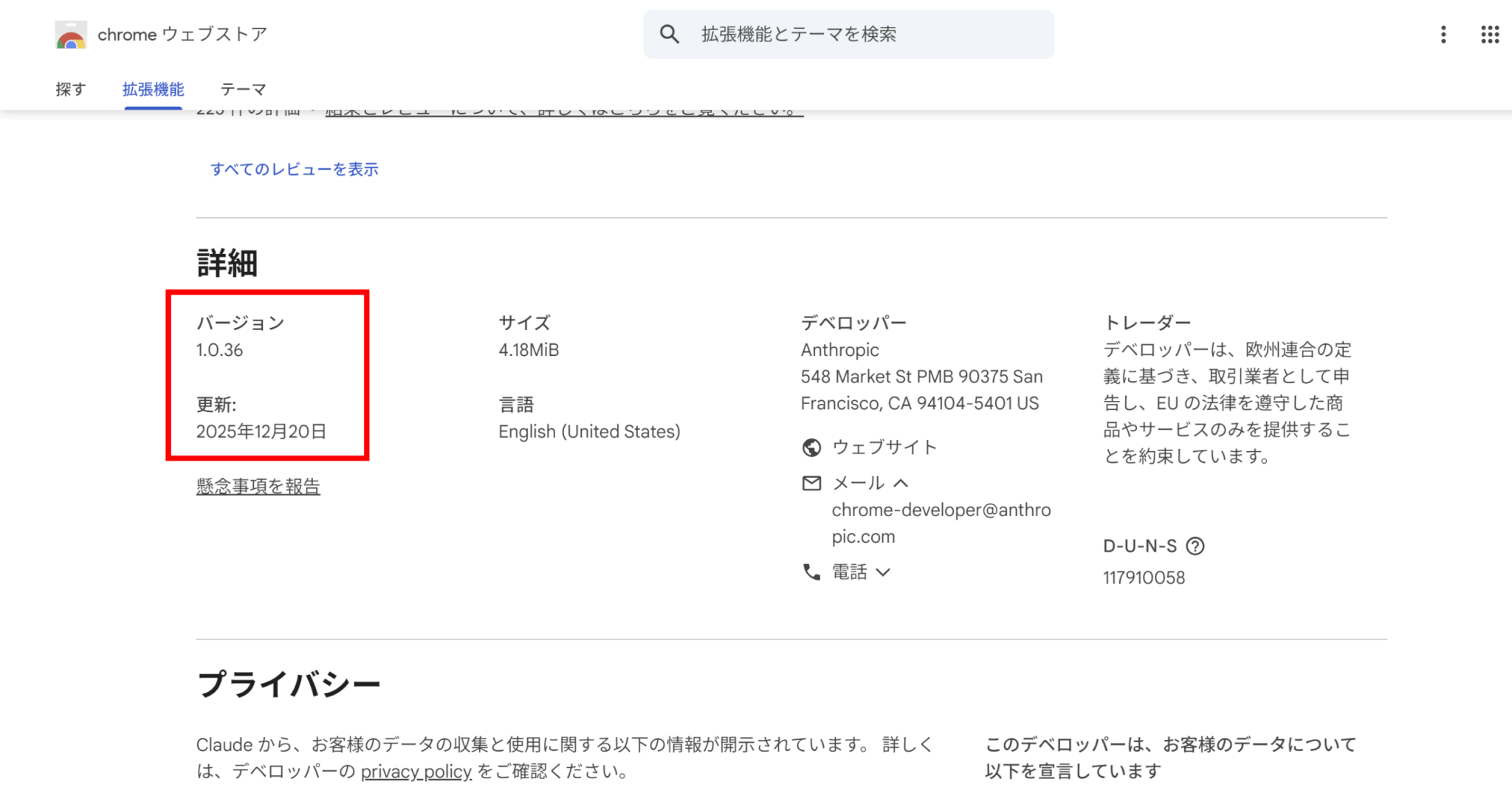 次に開発元情報で、開発者名や公式サイトがclaude.comになっているか、連絡先メールや所在地が明記されているかを確認します。
