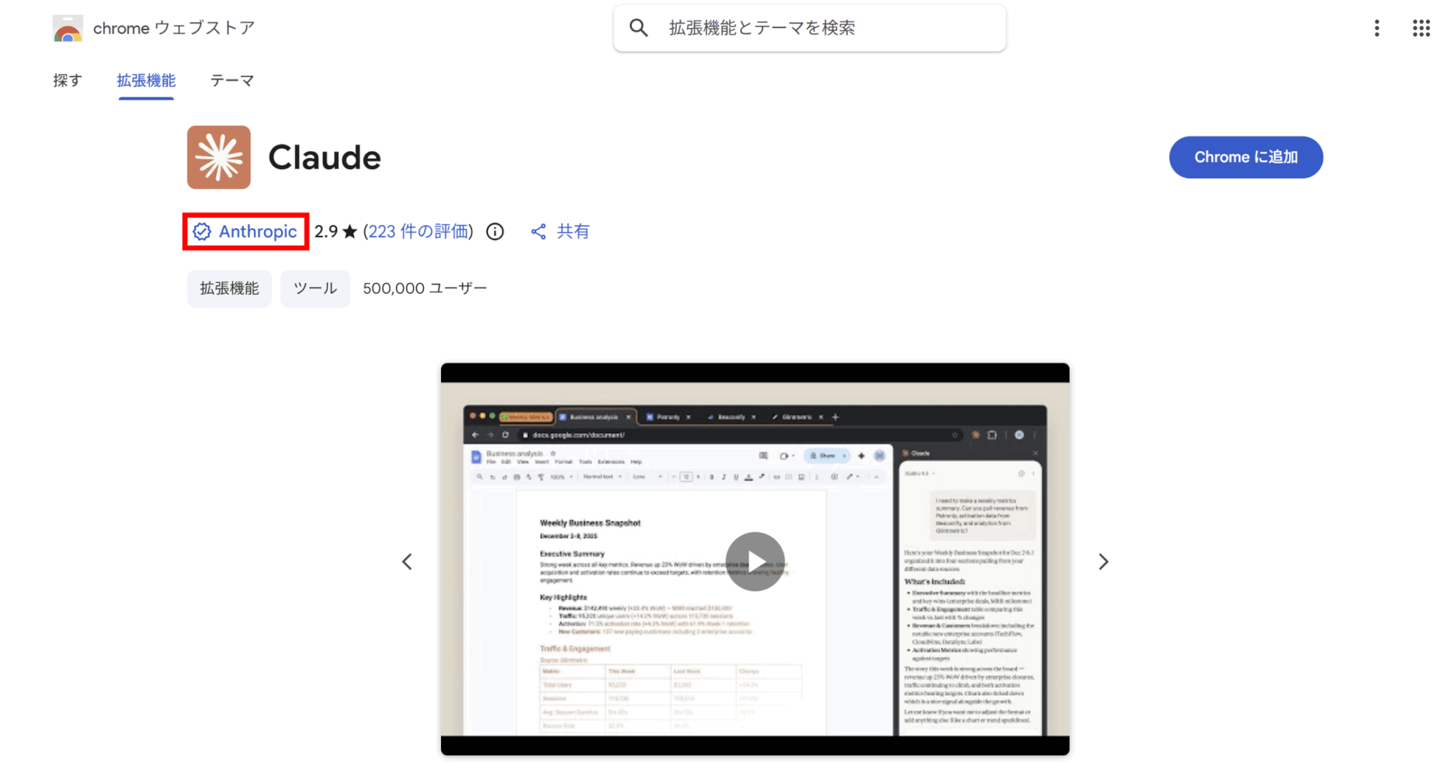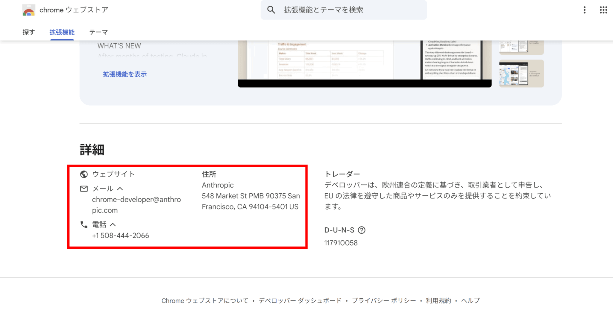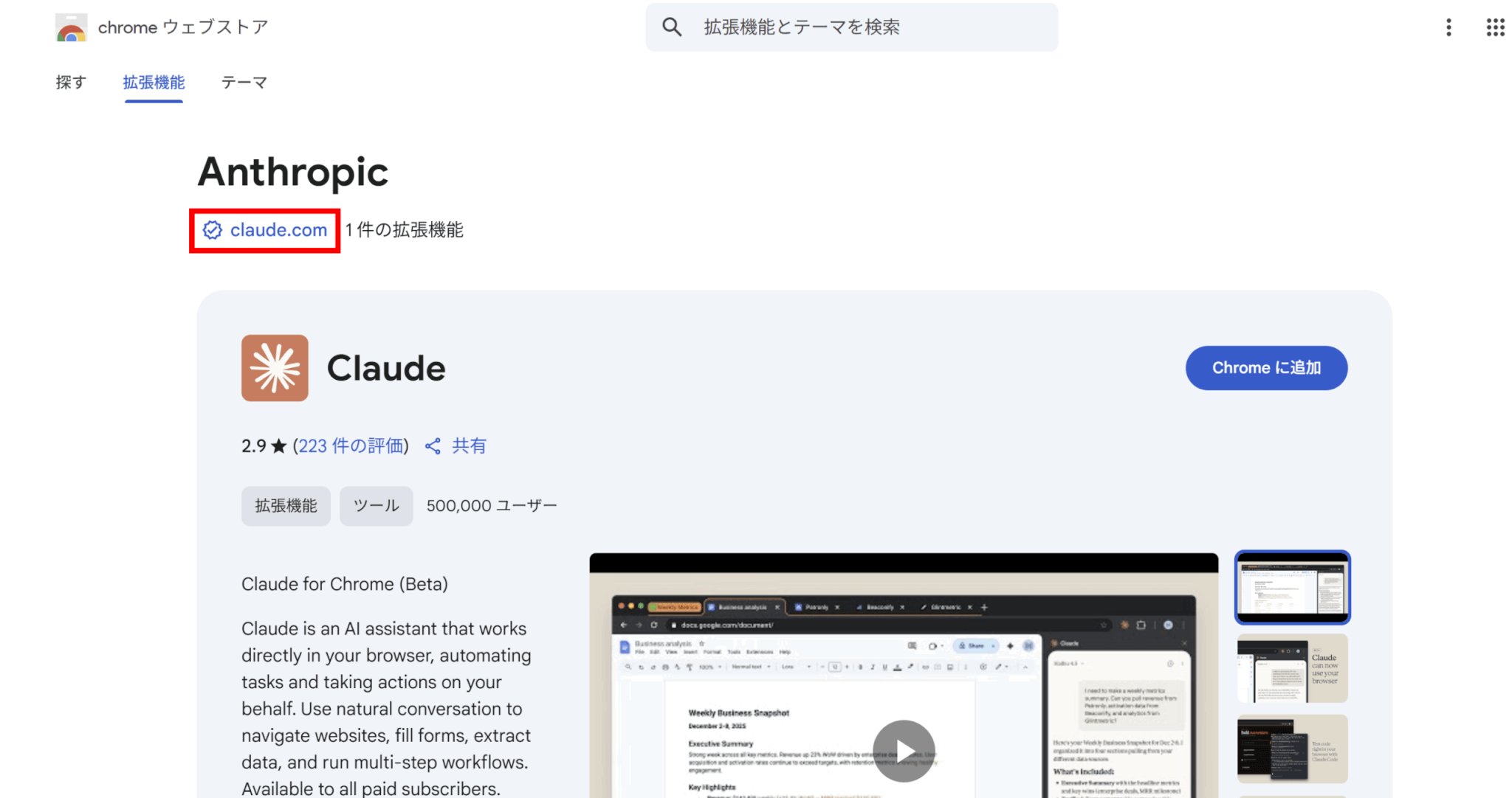 公式の拡張機能を見分けるには、まず配布元はChrome Web Storeであることを確認し、拡張機能ページの提供者がAnthropicであることを見ます。