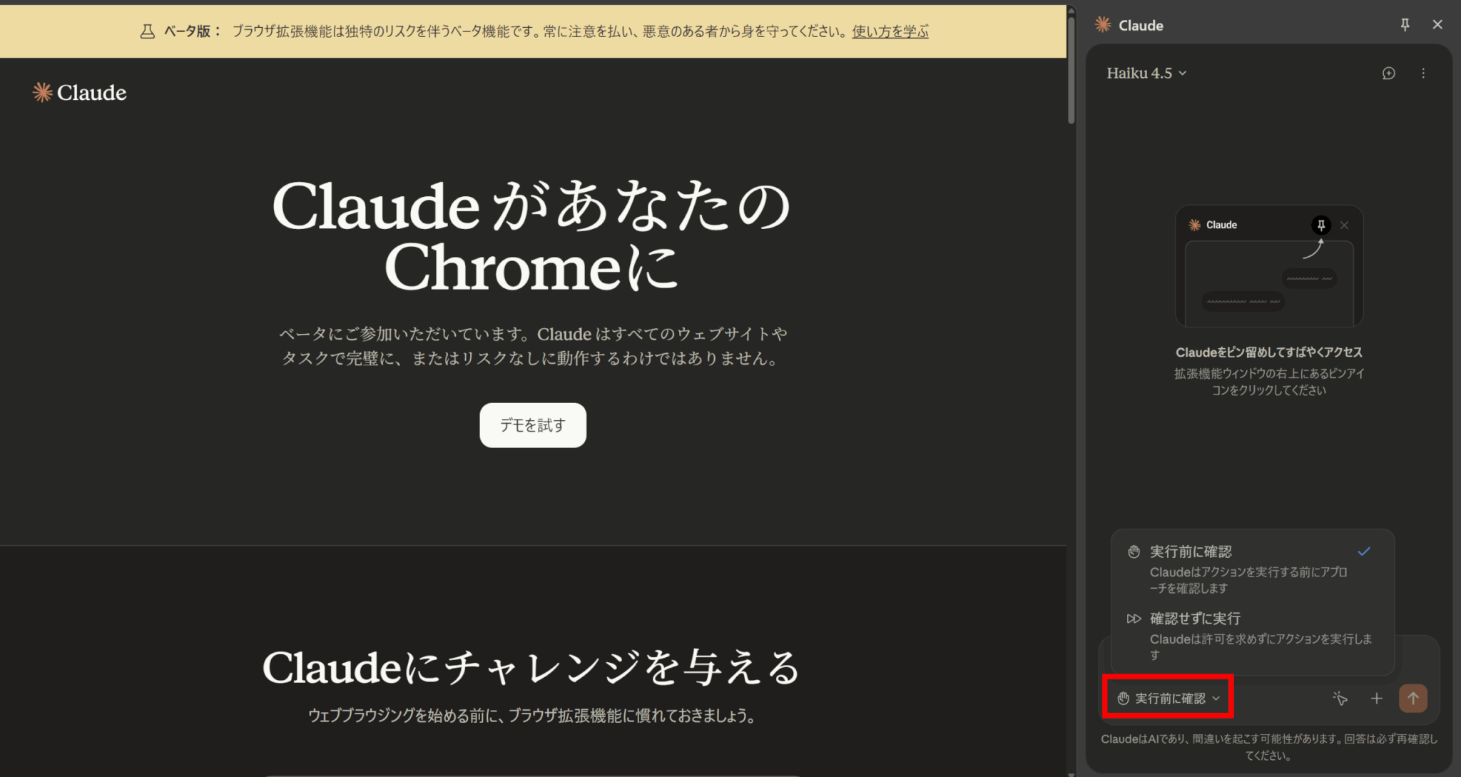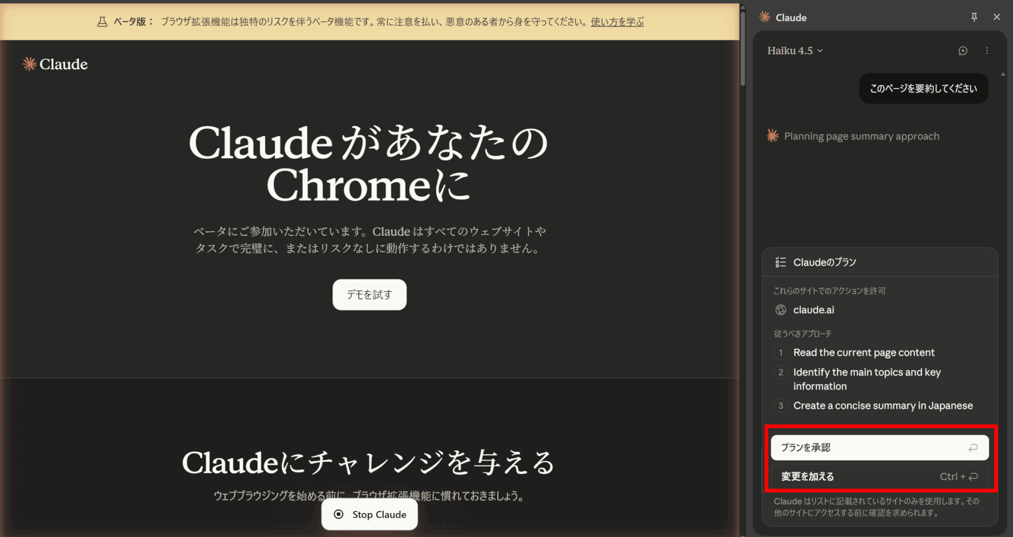 Claude for Chromeはブラウザを直接操作できることから、誤操作によるリスクを減らすために実行前に確認することをおすすめします。