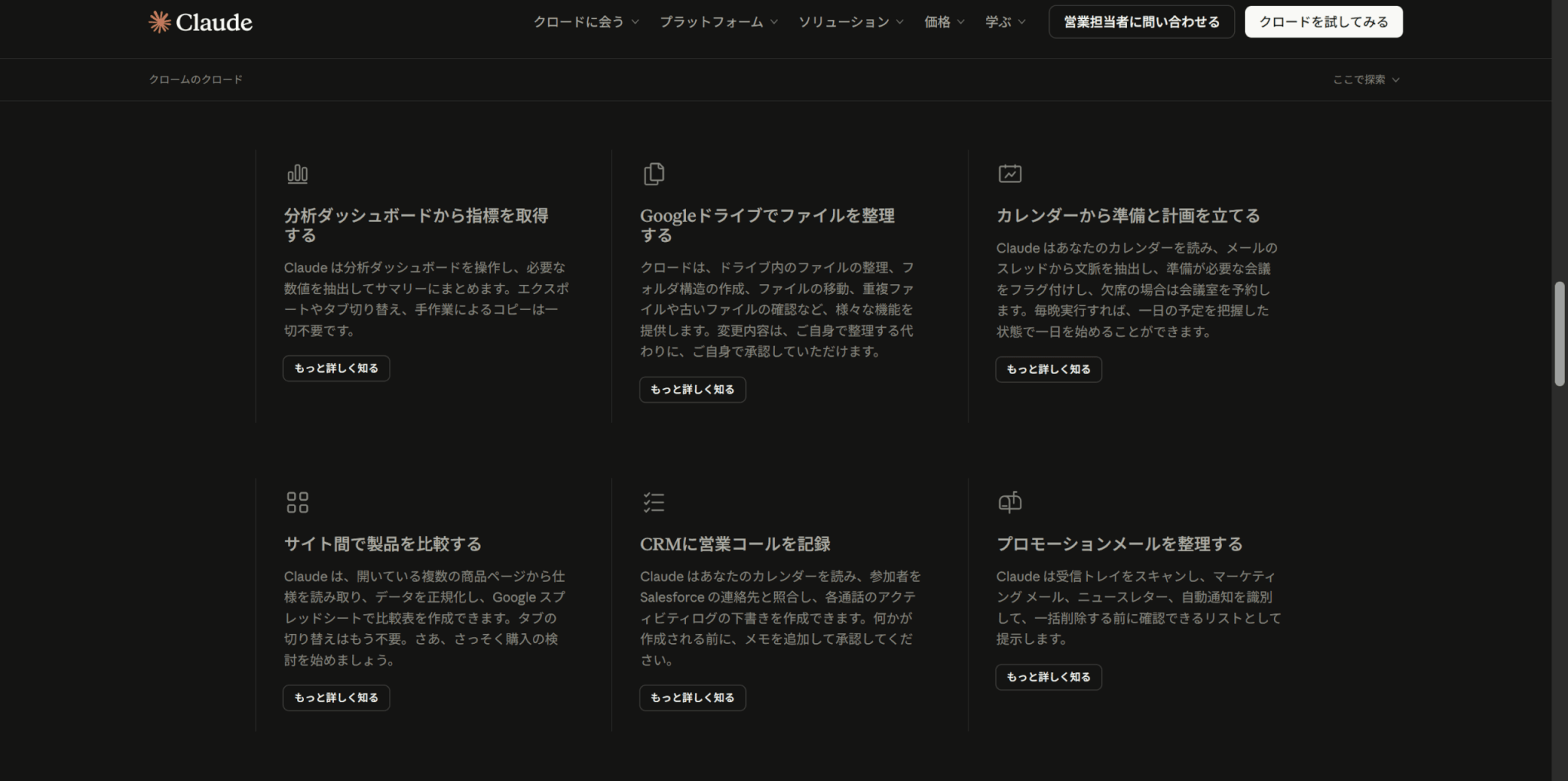 今開いているサイトに応じて、役立つプロンプト提案やヒントを提示する機能があります。この機能により、各ウェブサイトで何ができるかを探索する手間が減り、より効率的にClaudeを活用できるようになります。