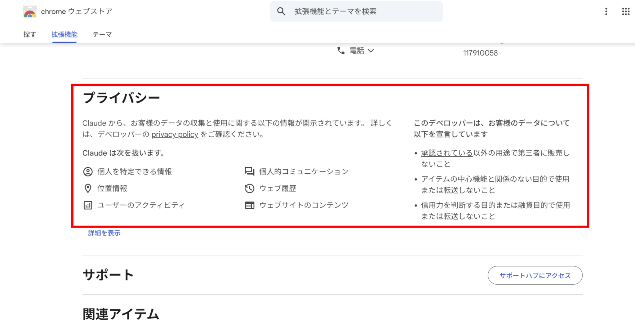 なお、Chrome Web Storeのプライバシー欄では、個人識別情報や閲覧履歴、サイト内容などを扱う可能性が示されるため、組織のデータ取り扱い基準と照合して導入可否を判断するようにしましょう。