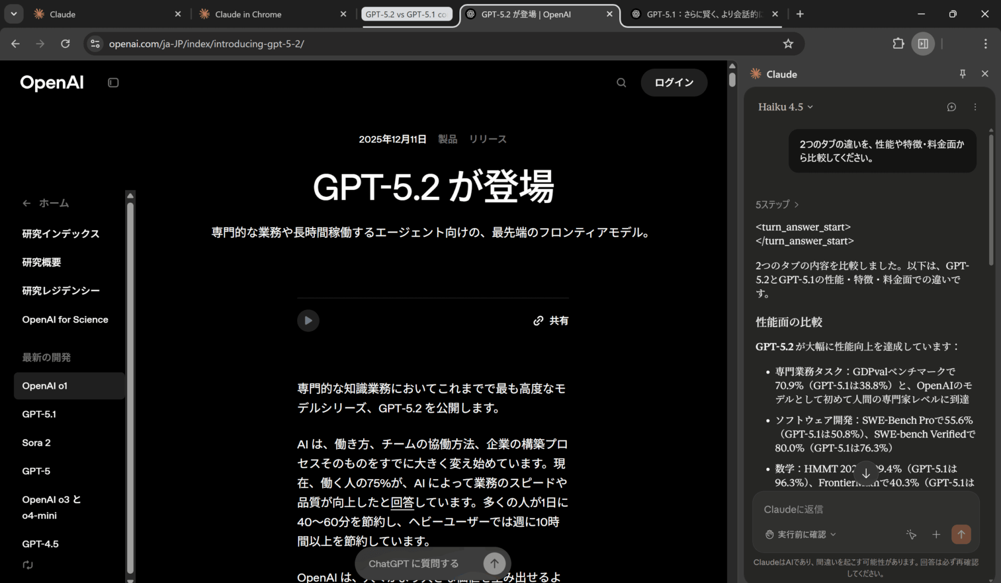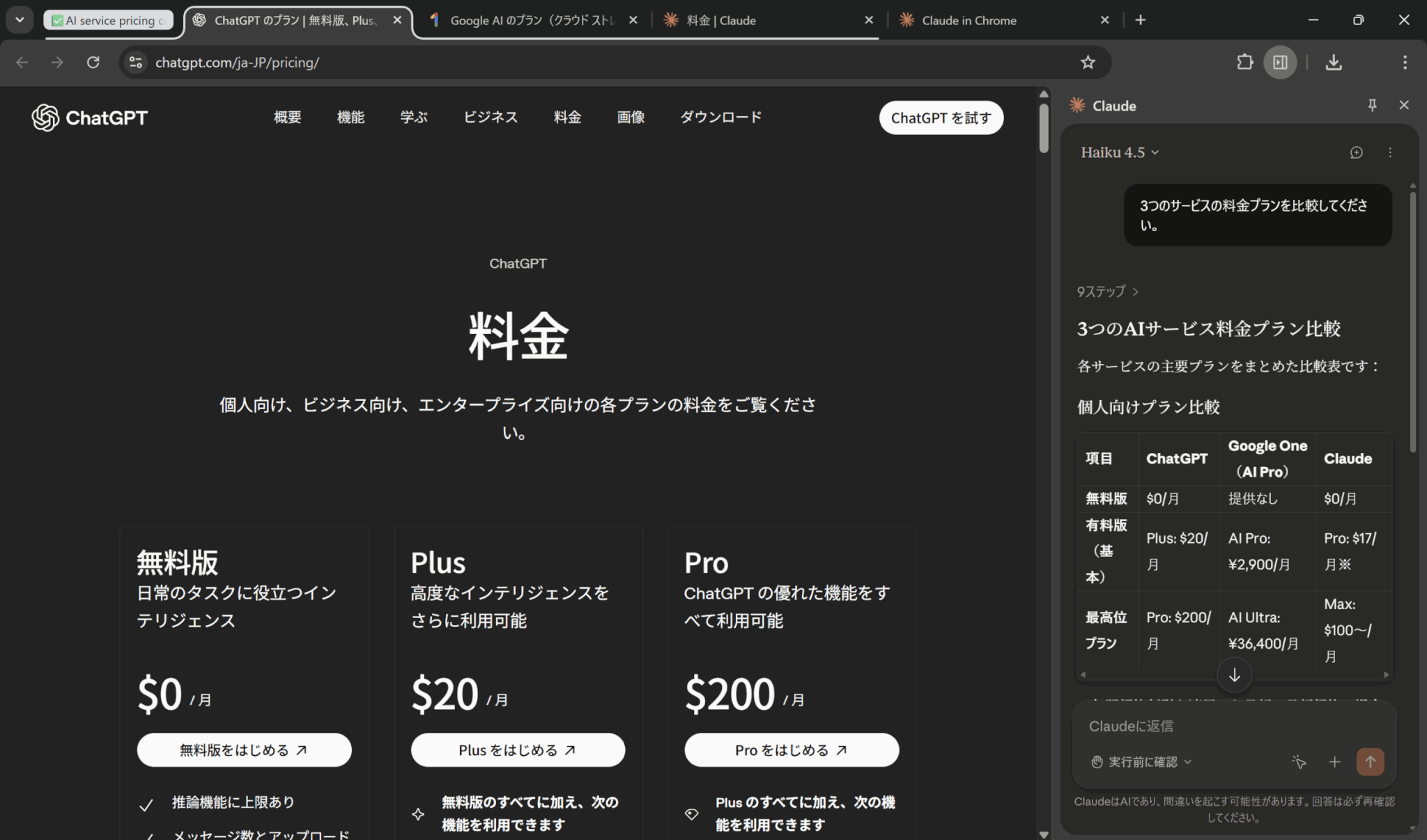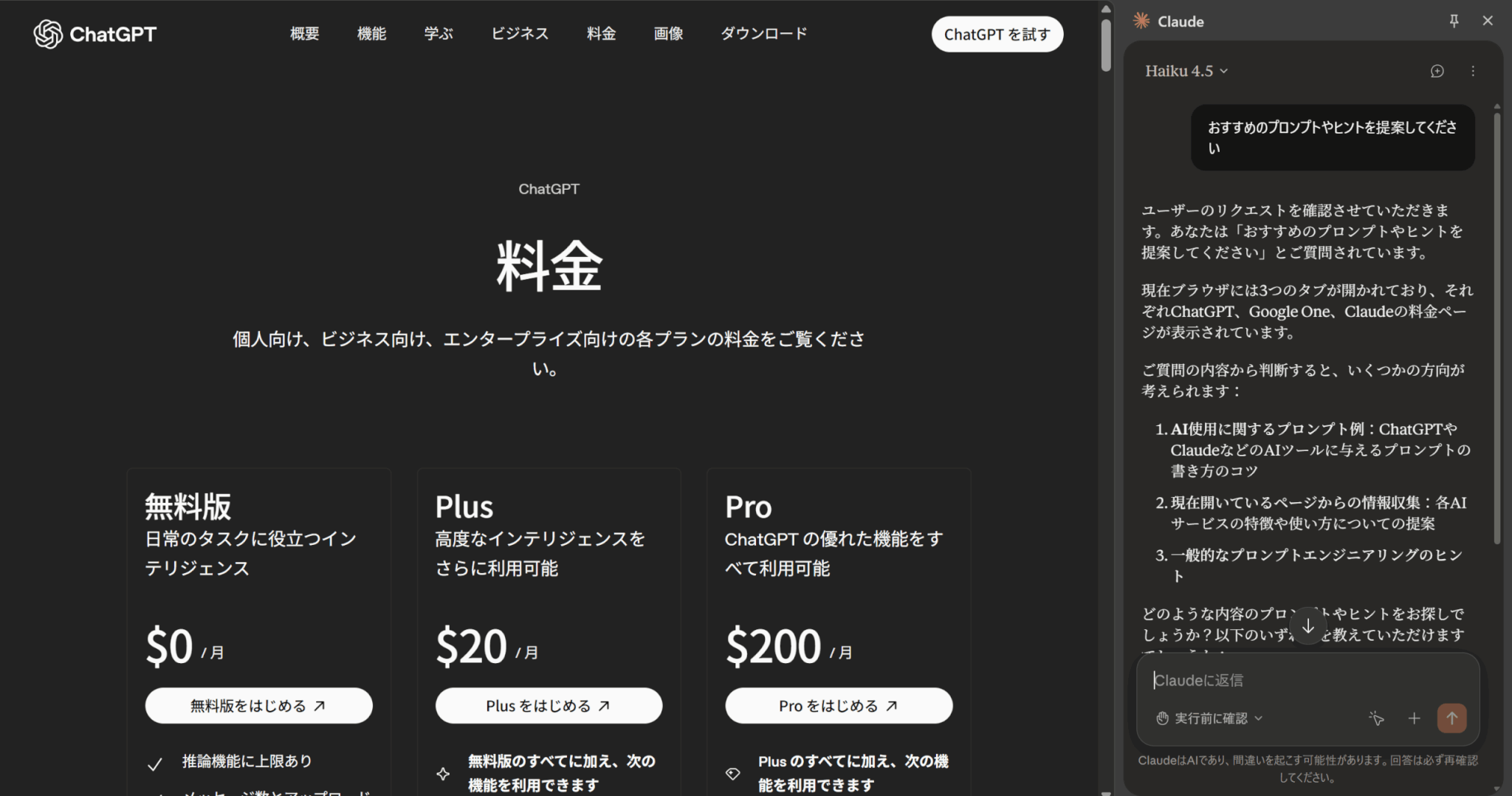複数のタブを比較する場合は、比較軸を先に列挙すると効率的です。以下の画像ではプロンプトとして「2つのタブの違いを、性能や特徴・料金面から比較してください。」と入力しました。
