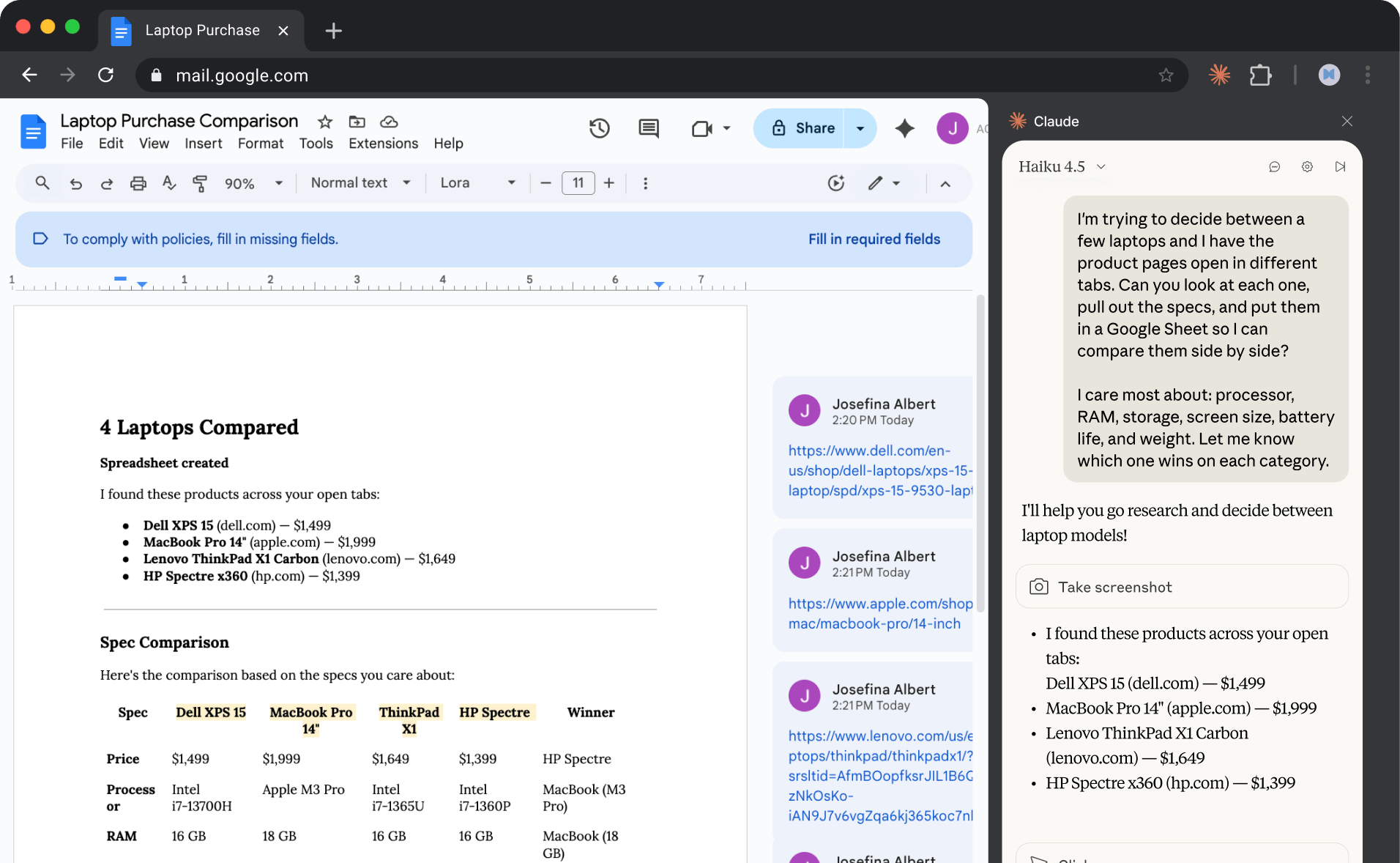 Claudeのサイドパネルを開くと、Claudeはアクティブなブラウザタブのスクリーンショットを撮影し、ウェブページのコンテンツを理解します。つまり、Claudeは画面に表示されているあらゆる情報(個人データ、機密文書、あなたまたは他人の個人情報など)を閲覧できることになります。
