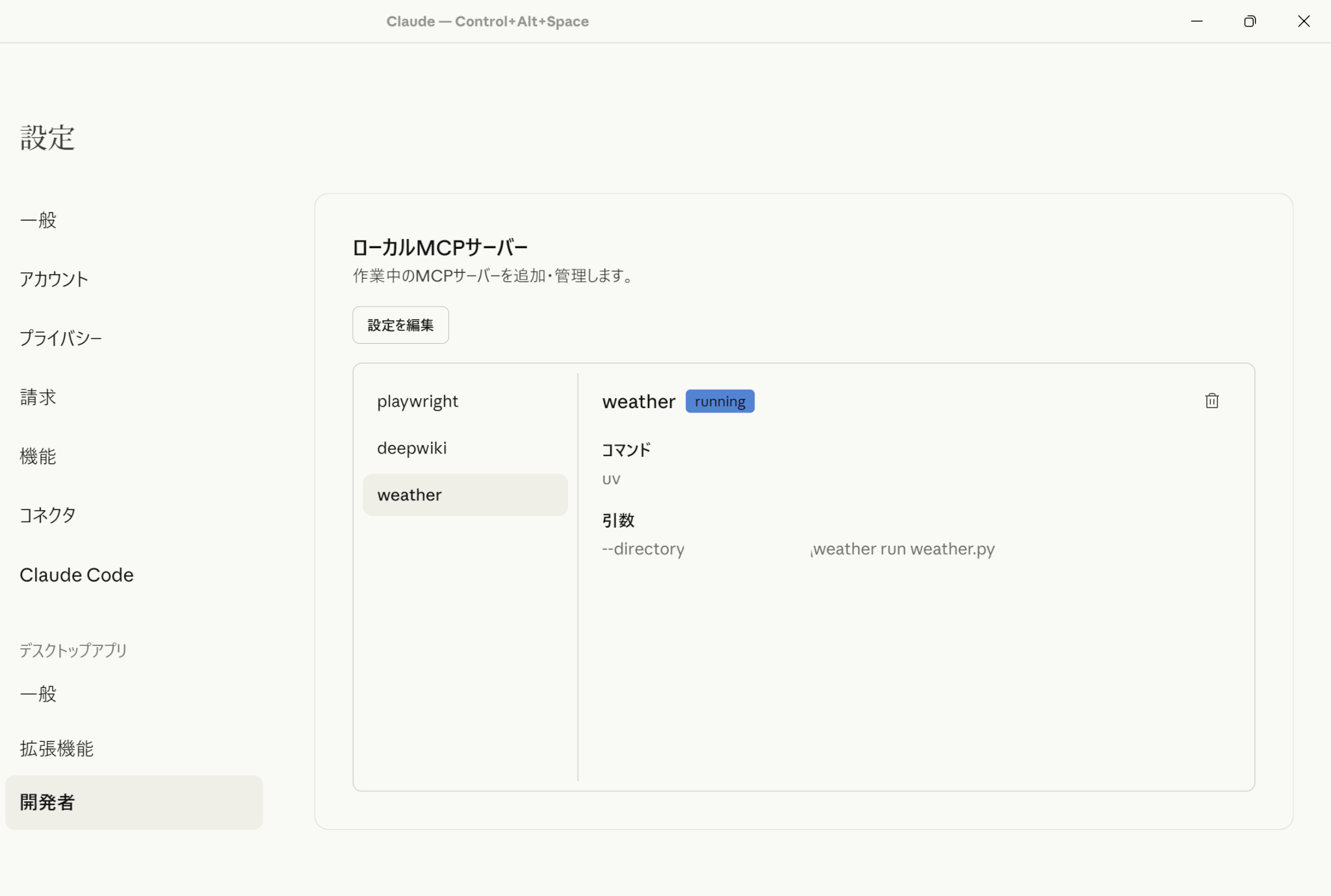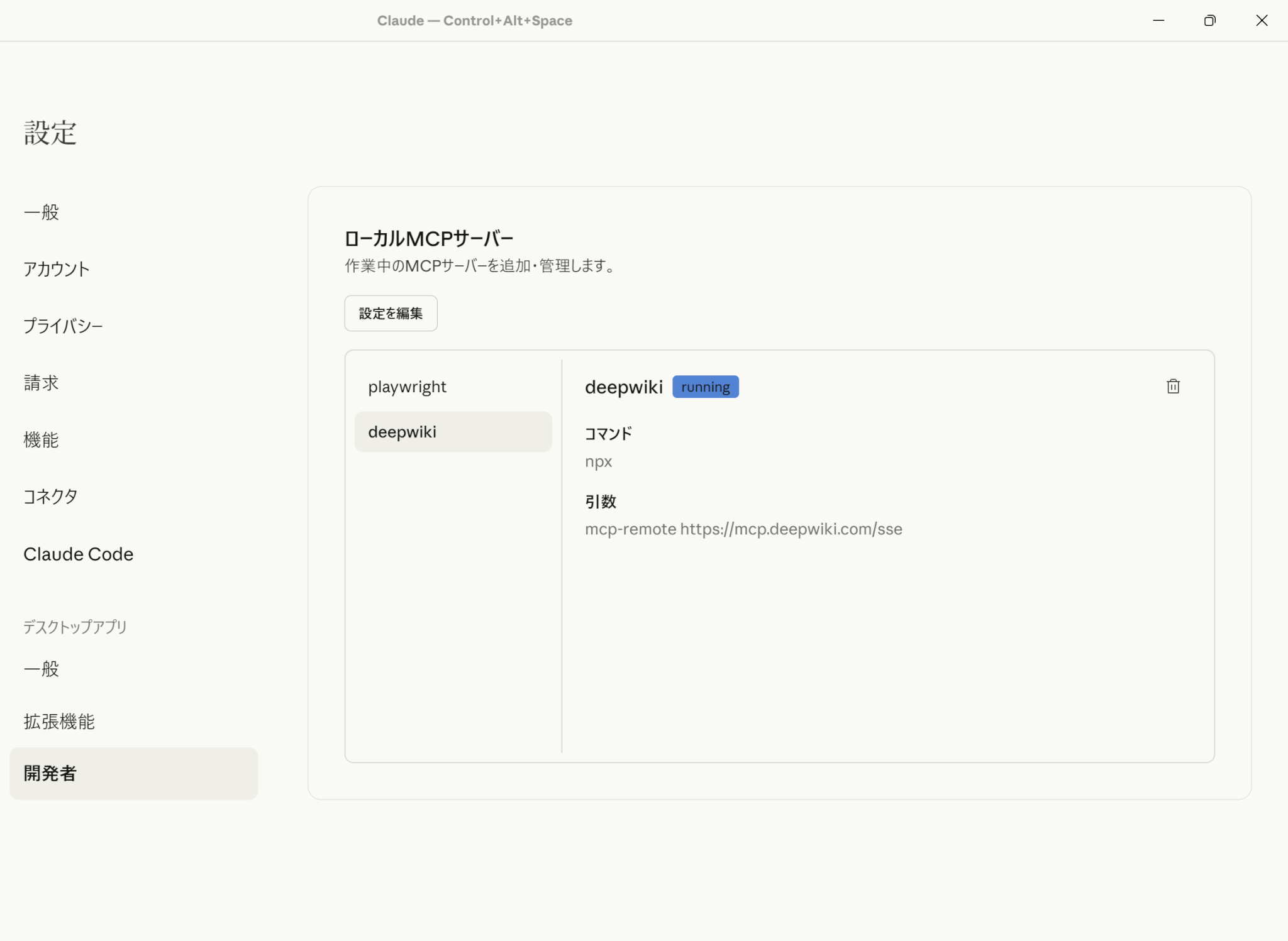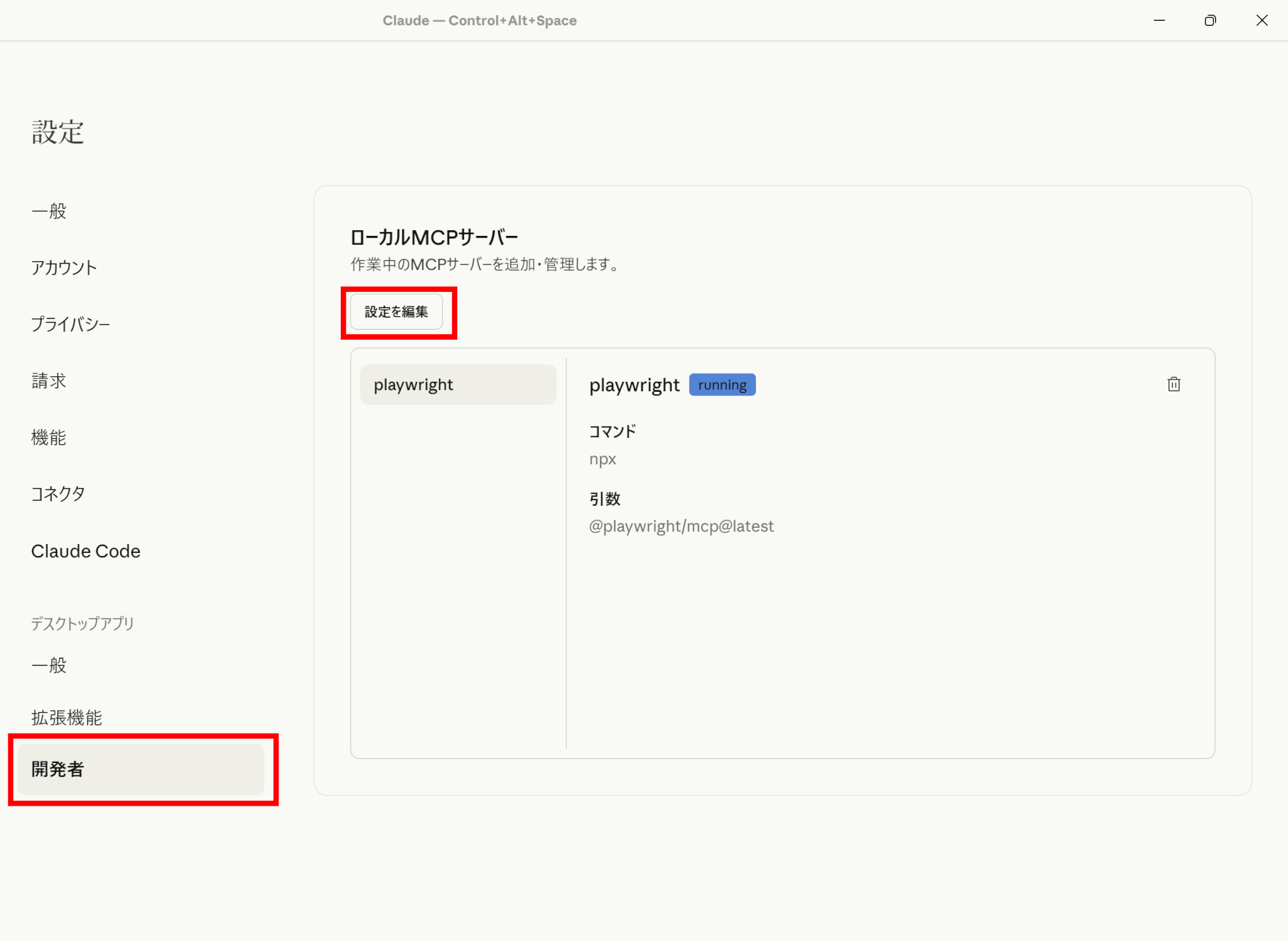 再起動後、先ほどの「開発者」タブを見ると追加したMCPサーバーが表示されています。