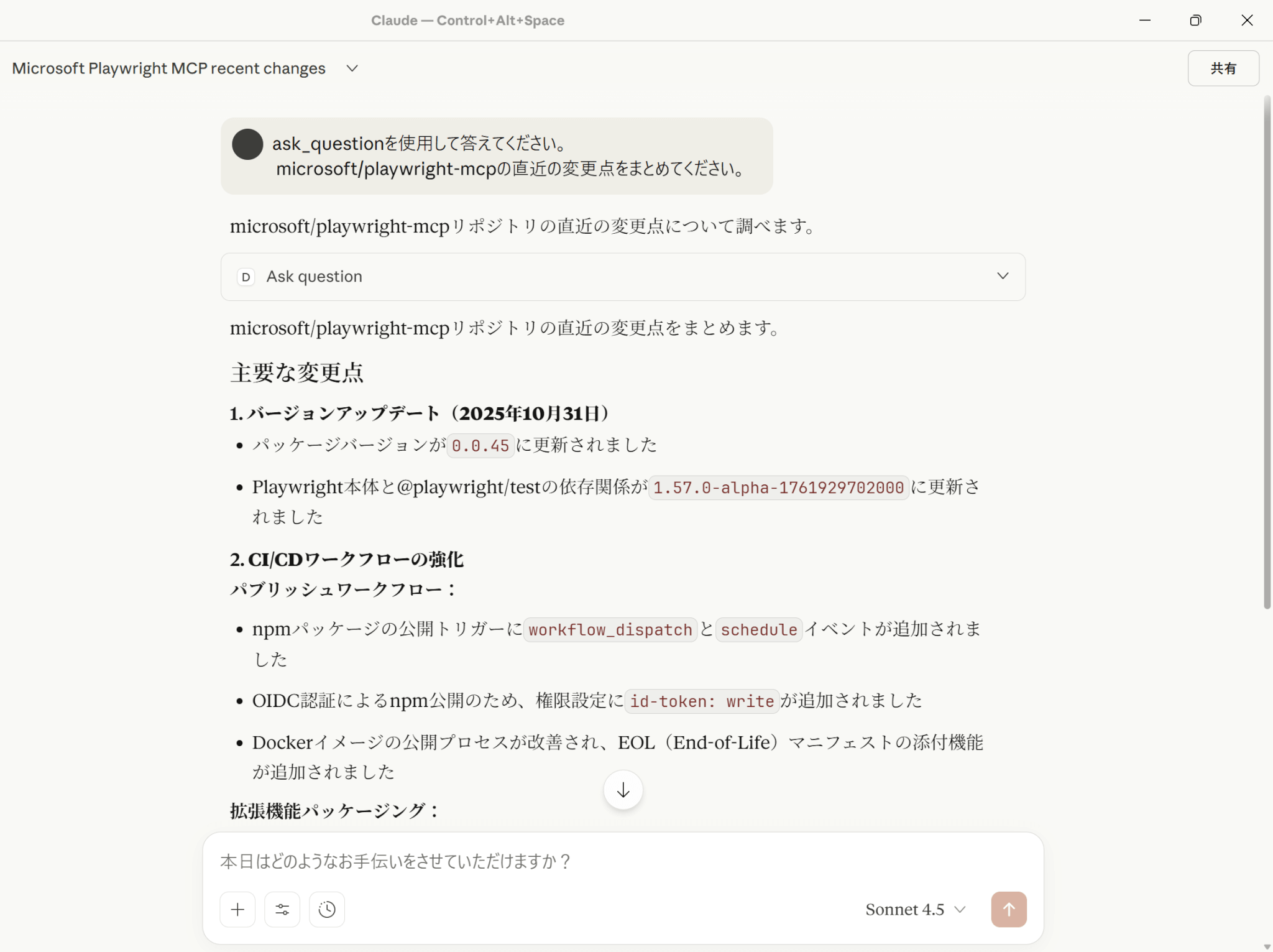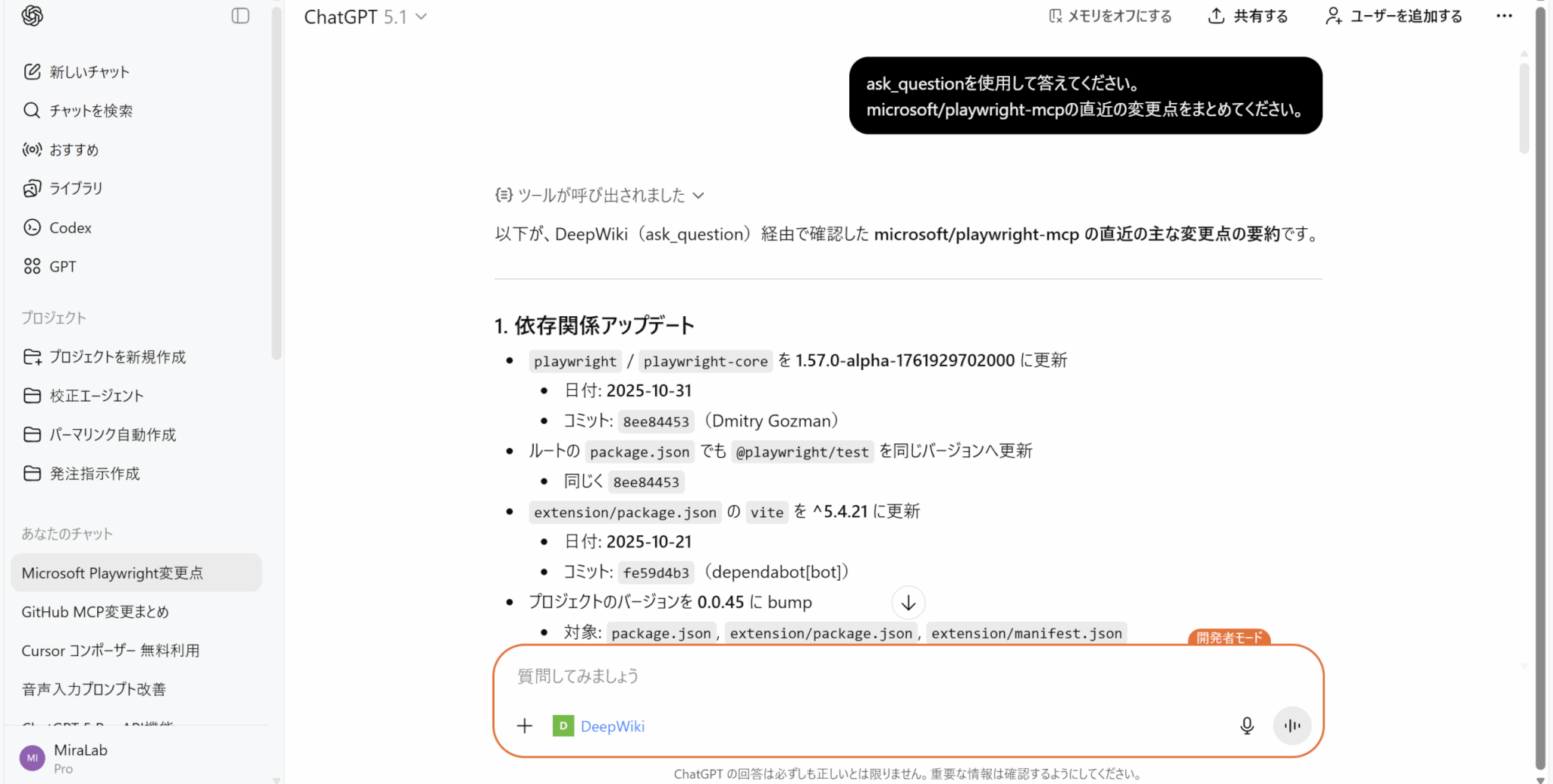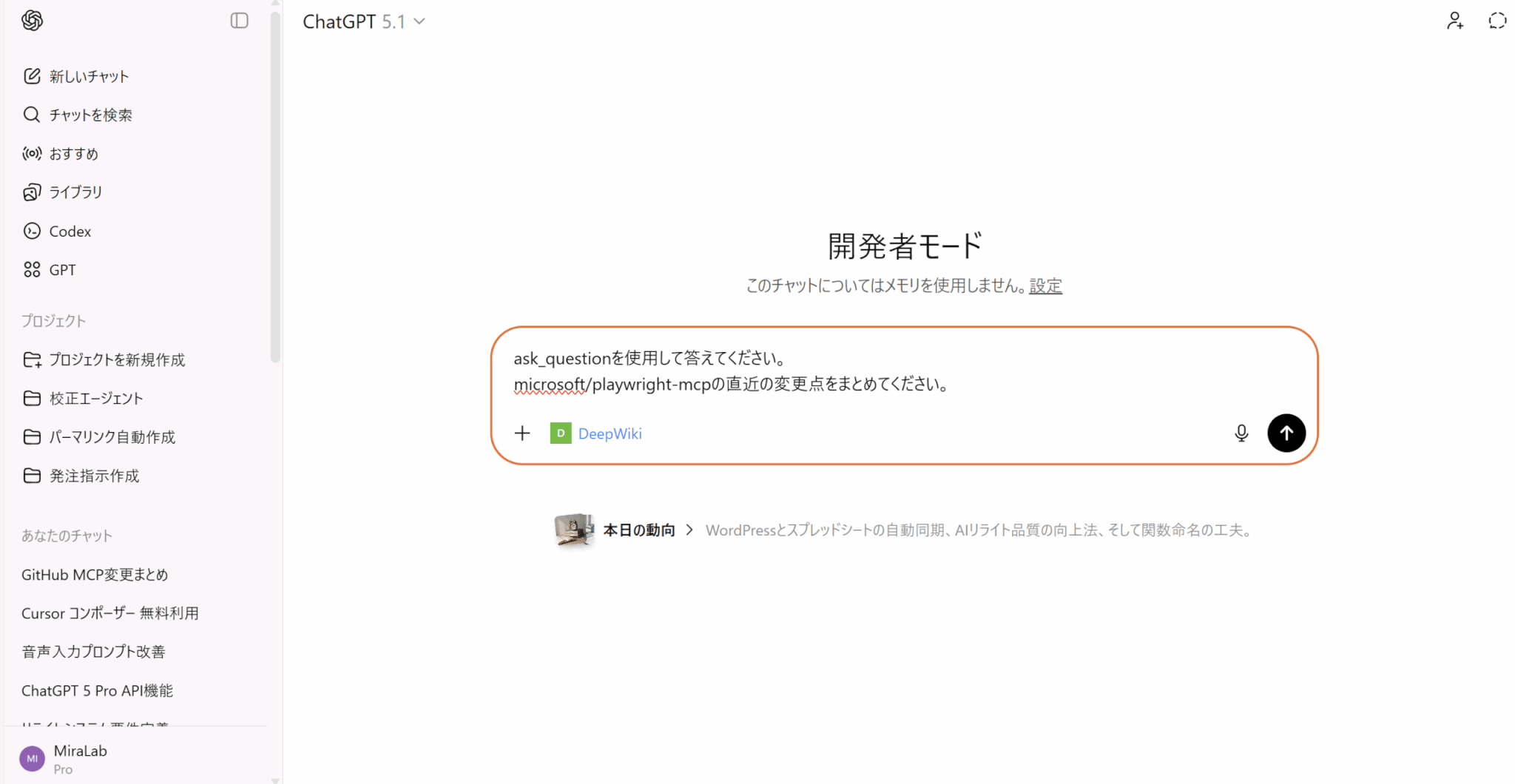 これでMCPサーバーが利用可能となったので、ChatGPTと同様に使用するツールを明示しつつ指示を与えましょう。