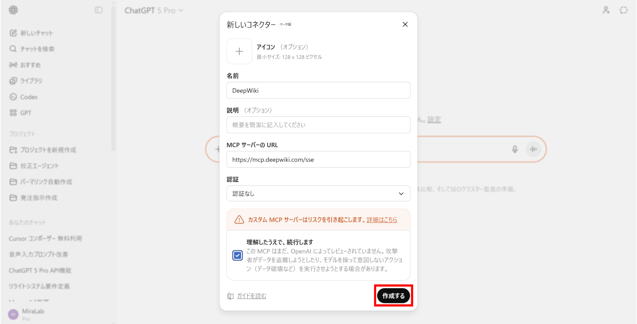 名前や説明、MCPサーバーのURLを入力して「作成する」をクリックしましょう。
