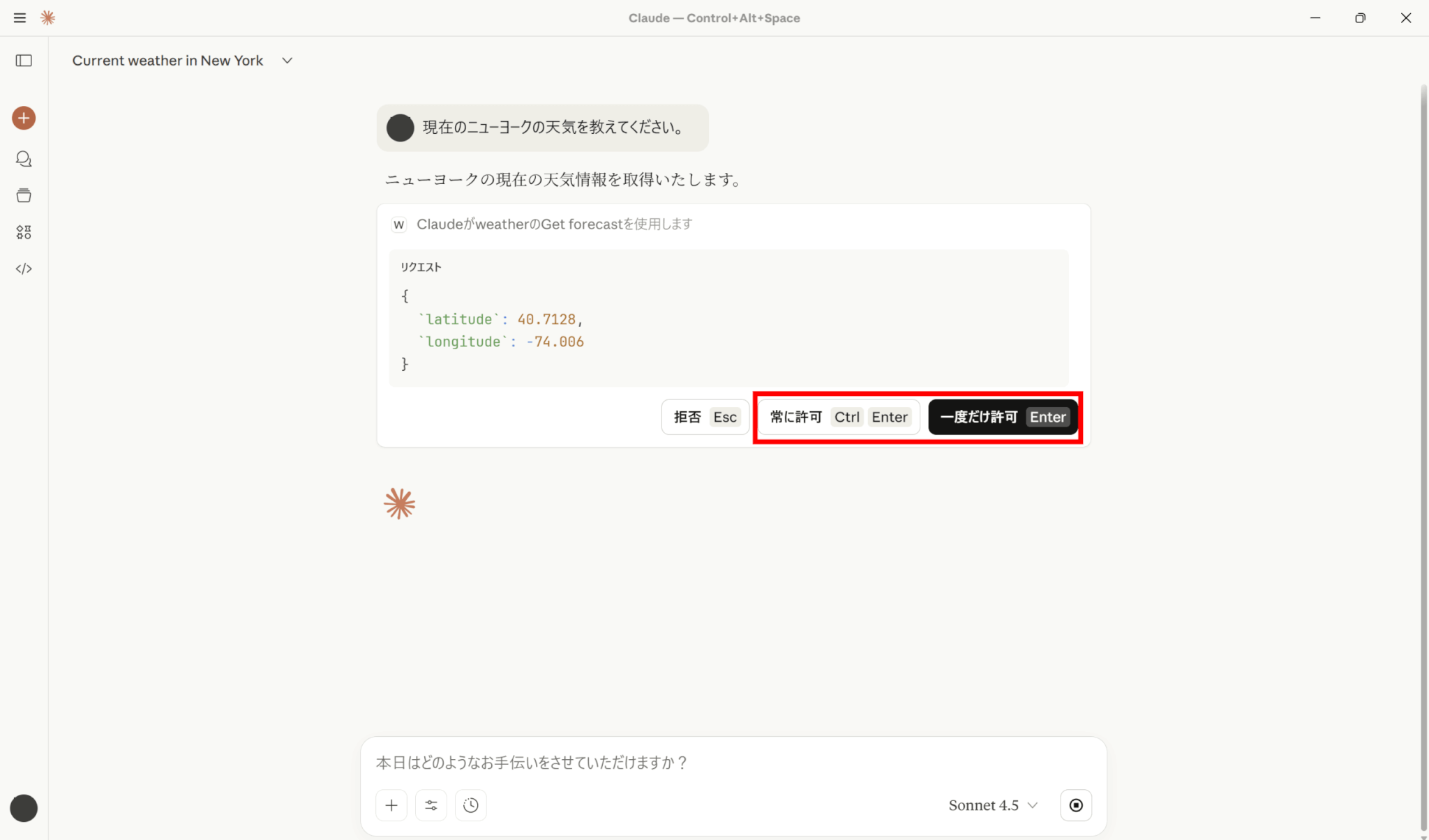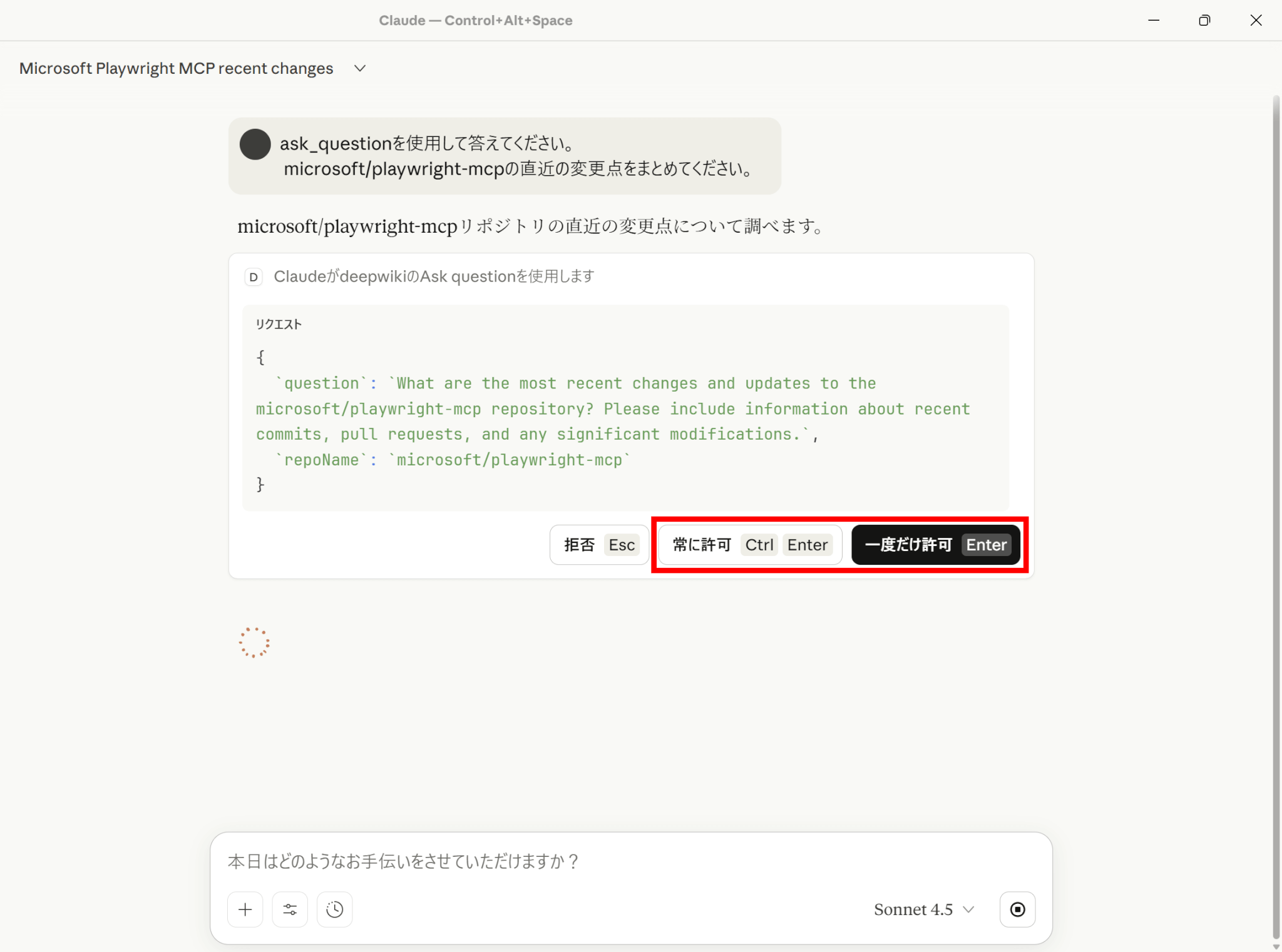 許可を求められるので、「一度だけ許可」または「常に許可」をクリックすることで、MCPを通じた回答が出力されます。