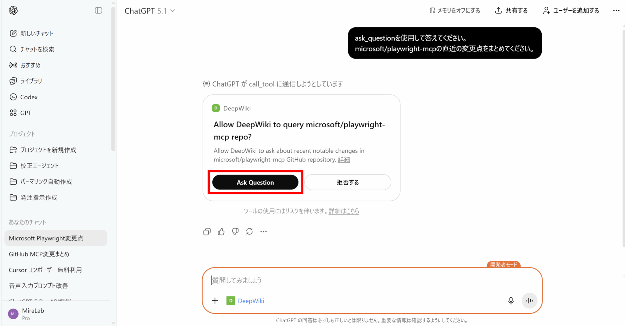 実際にMCPサーバーと通信する際に許可を求められるため、「Ask Question」をクリックして許可します。