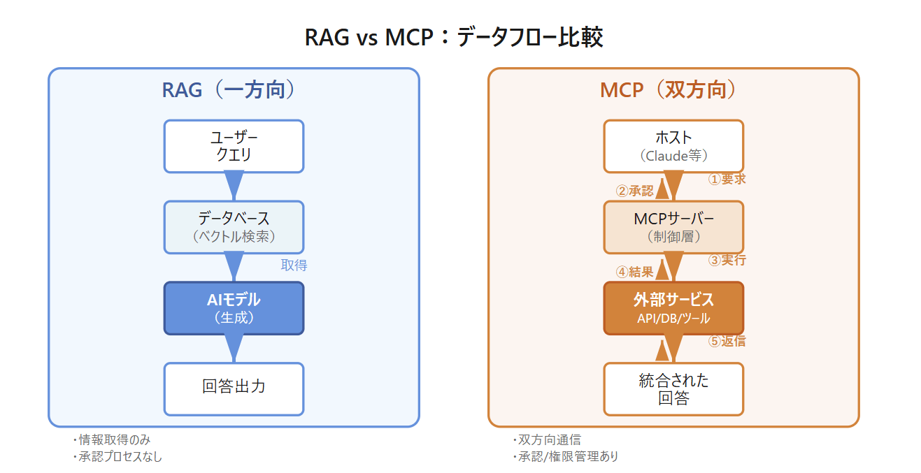 データフローにおいて、RAGは「データベース→AIモデル」という一方向な情報取得が主ですが、MCPは「AIモデル↔ホスト」間で行われる双方向のリクエストと承認のやり取りが最大の特徴です。