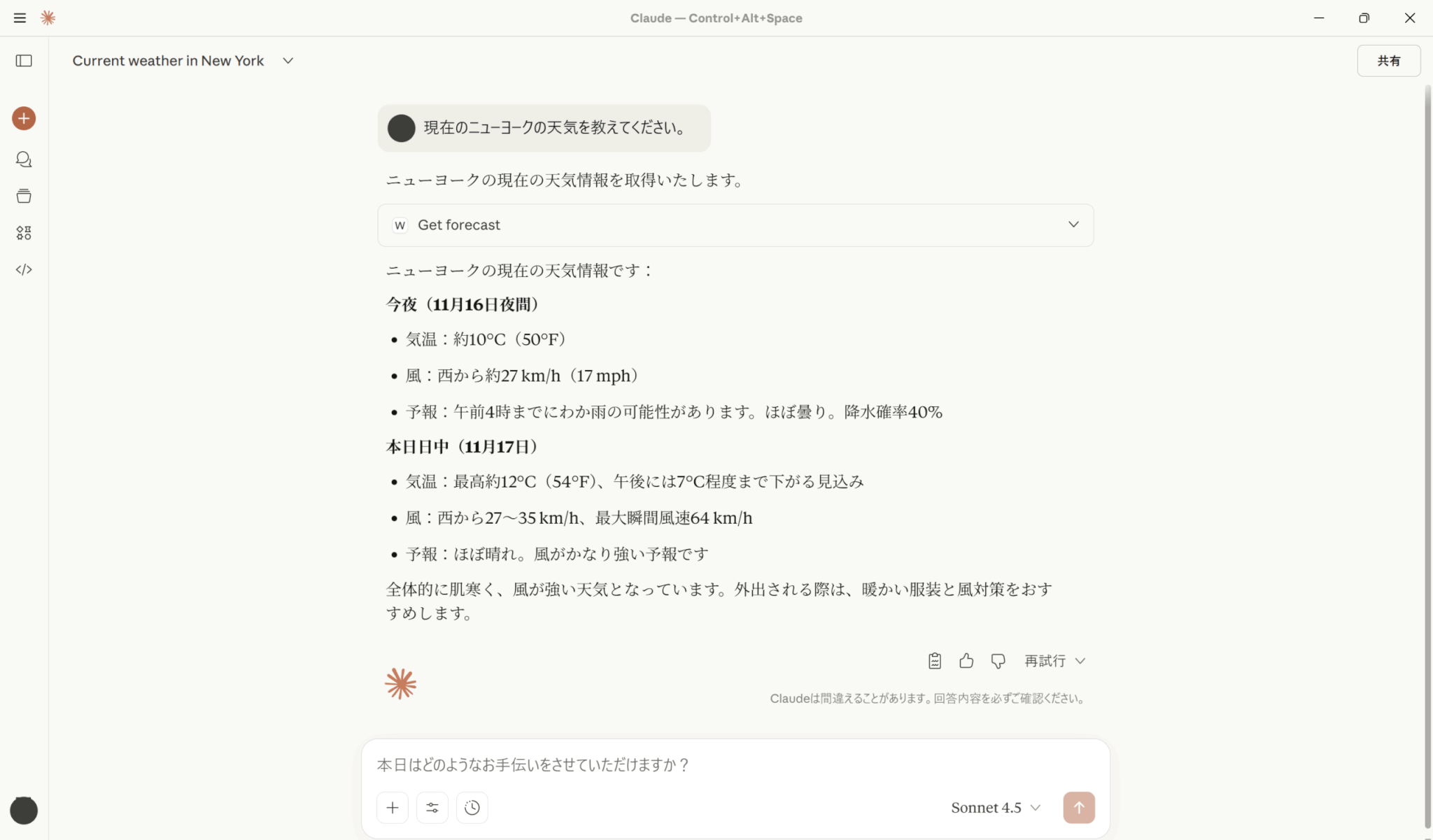 しばらくするとMCPサーバーを通じて得られた回答が出力されます。