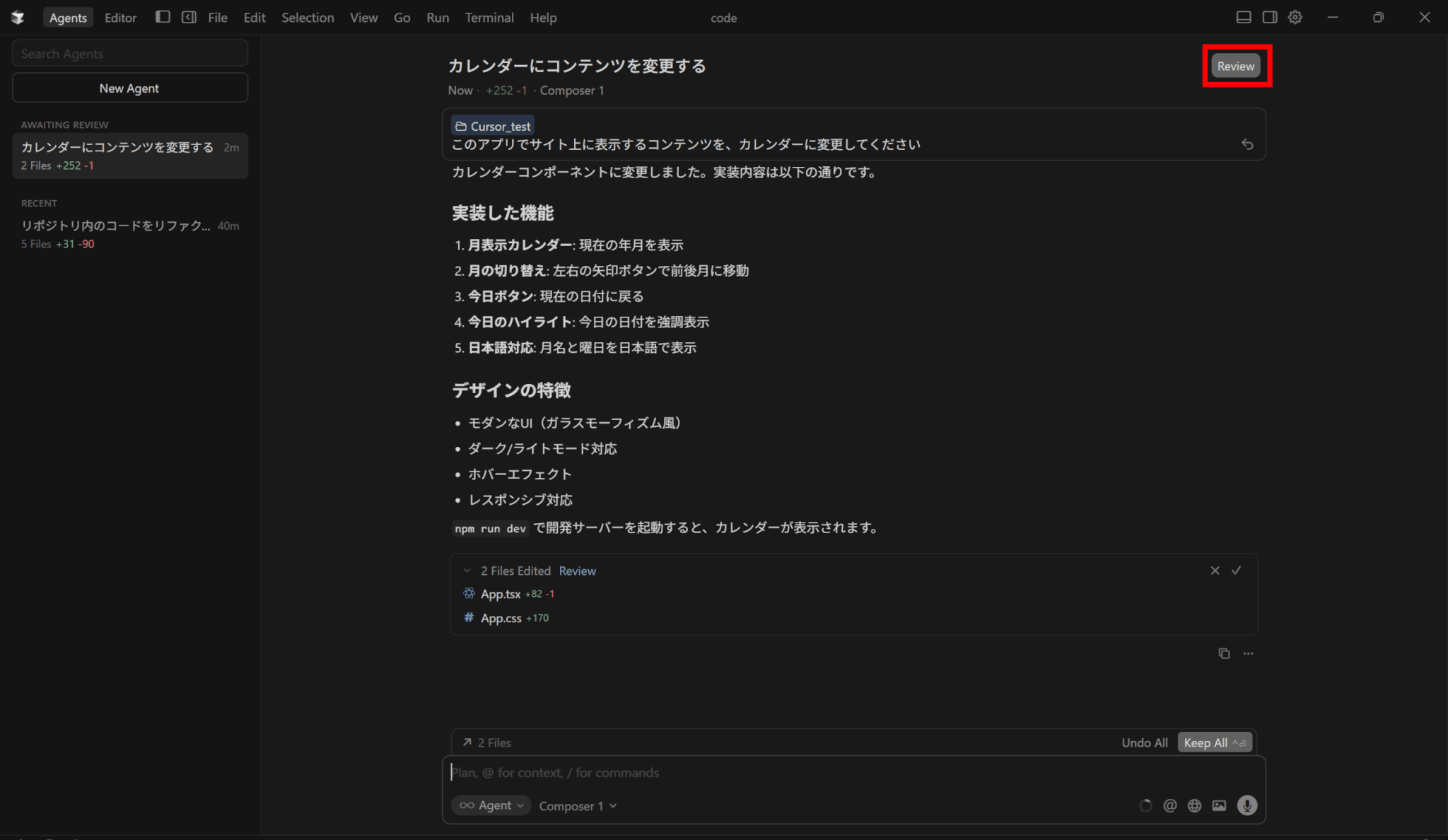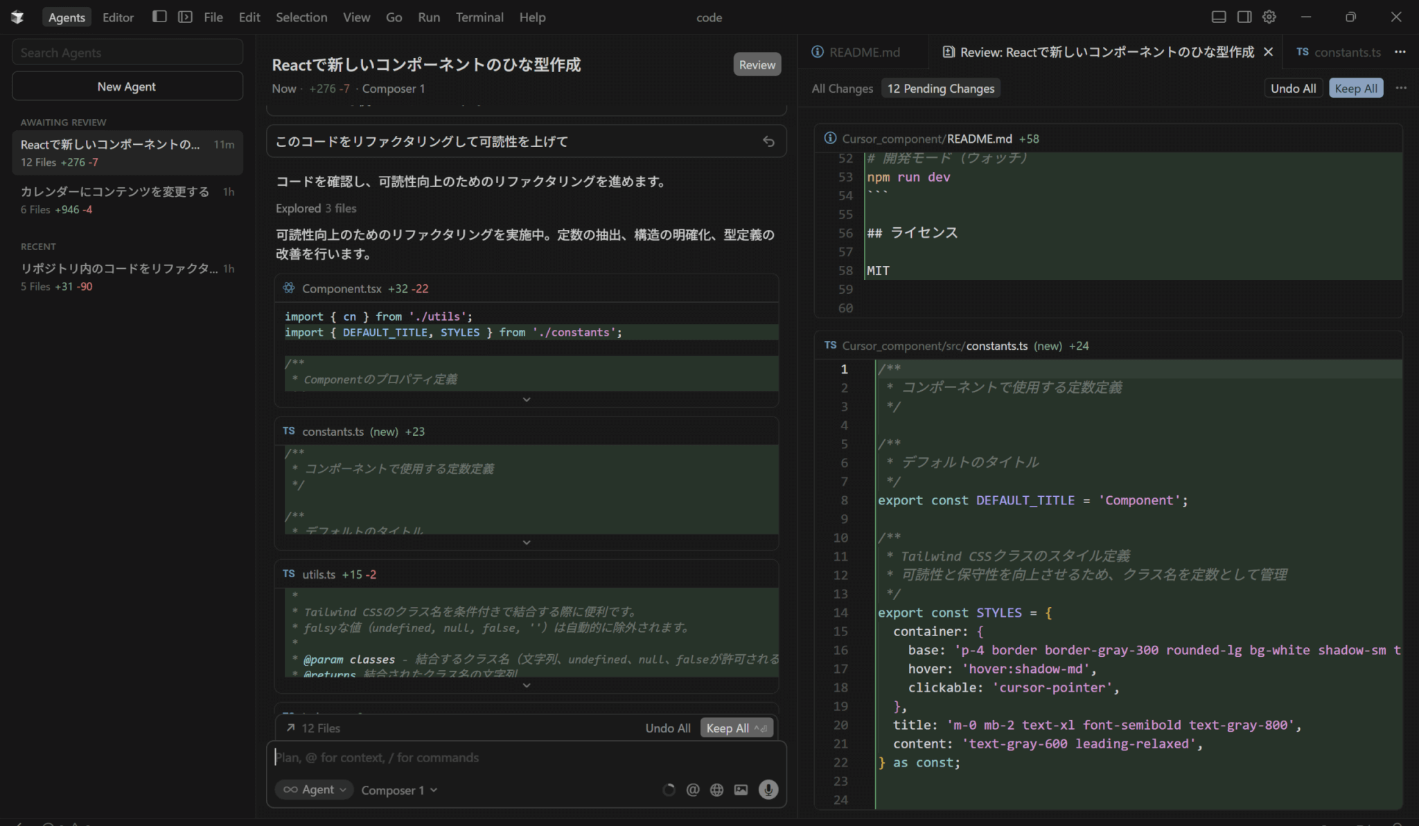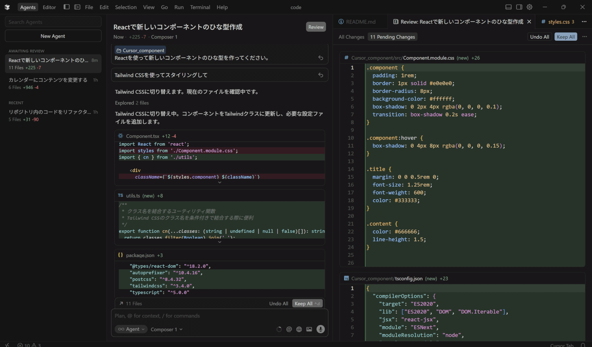 特に、コンポーネントの雛形作成や定型的なコード生成において、GPT-5 CodexやClaude Sonnet 4.5の実行を待つよりも、Composerで素早く叩き台を得る方が開発効率は格段に向上します。