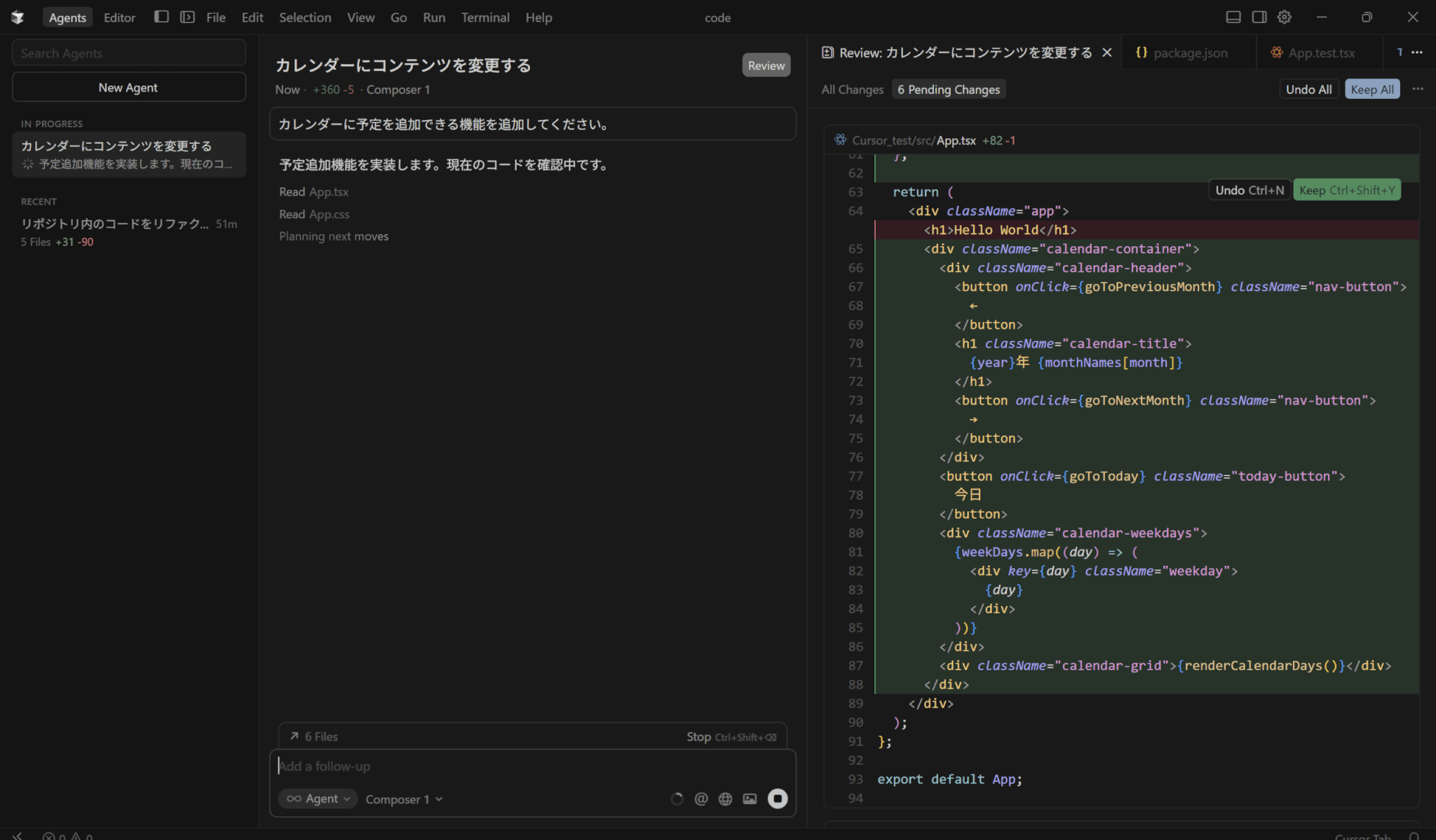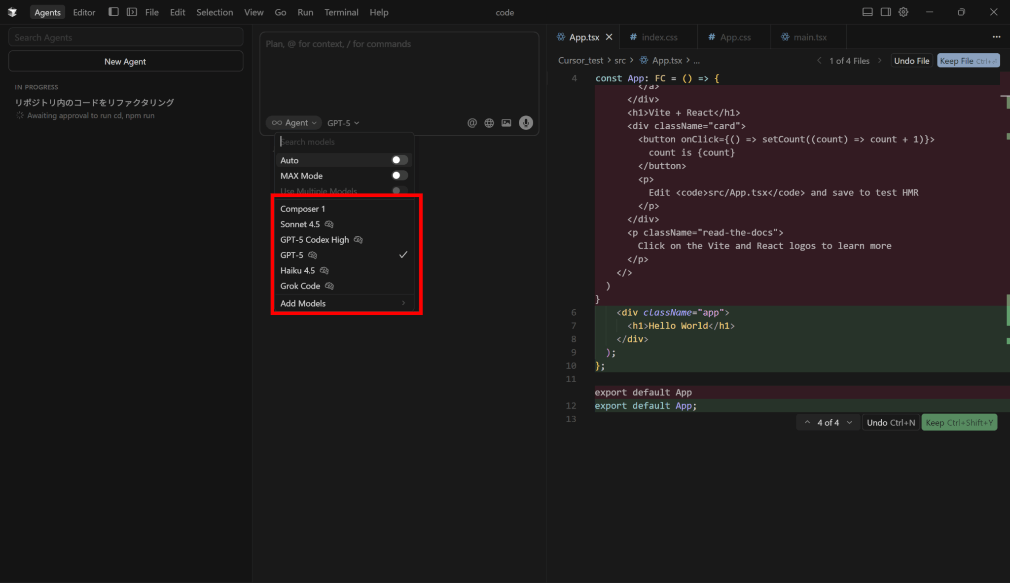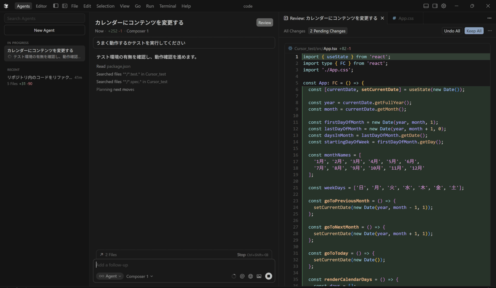 特に、コンポーネントの雛形作成や定型的なコード生成において、GPT-5 CodexやClaude Sonnet 4.5の実行を待つよりも、Composerで素早く叩き台を得る方が開発効率は格段に向上します。