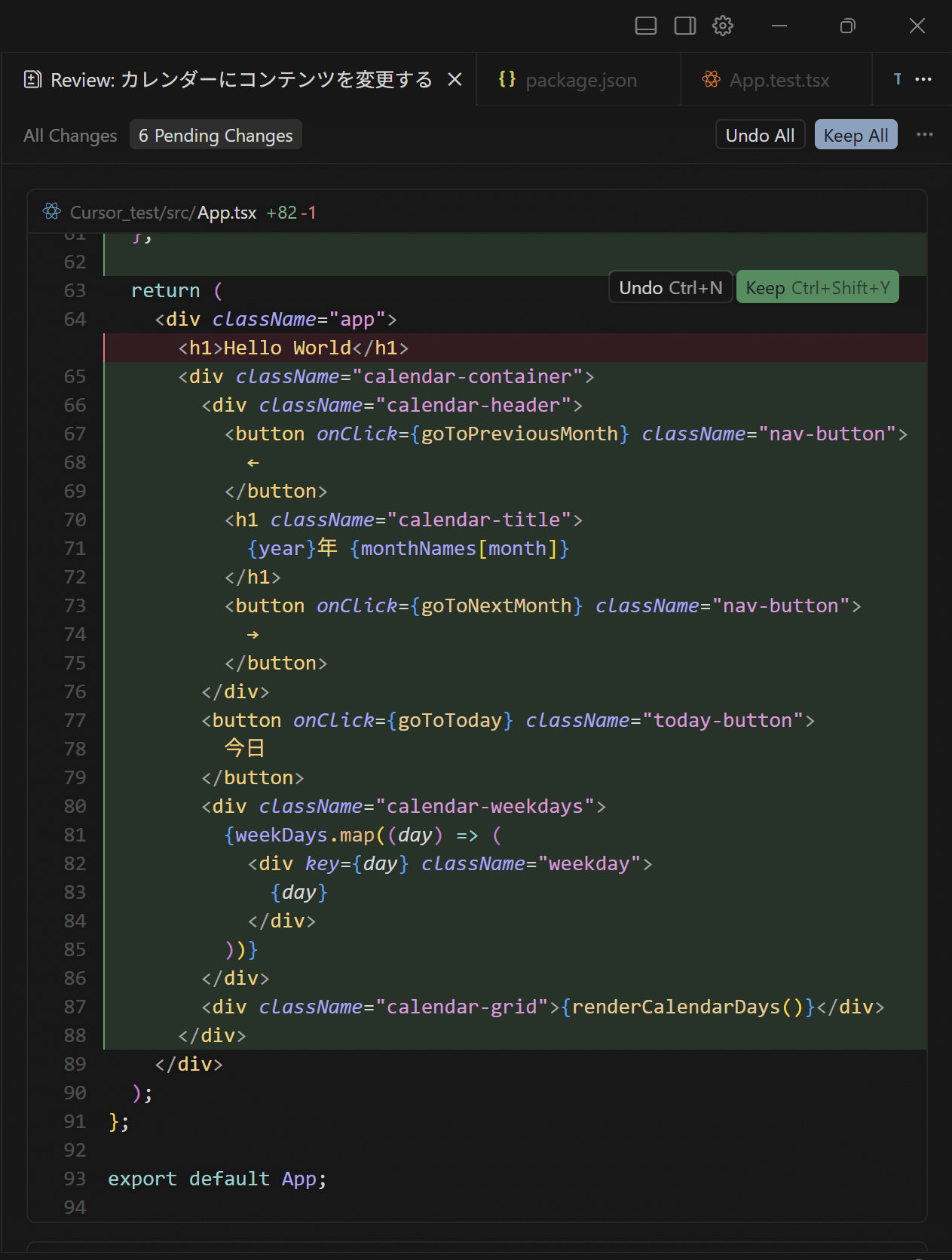 差分レビューで想定外の変更をしている場合や、テスト結果に問題がある場合、再度プロンプトを送ることで修正できます。