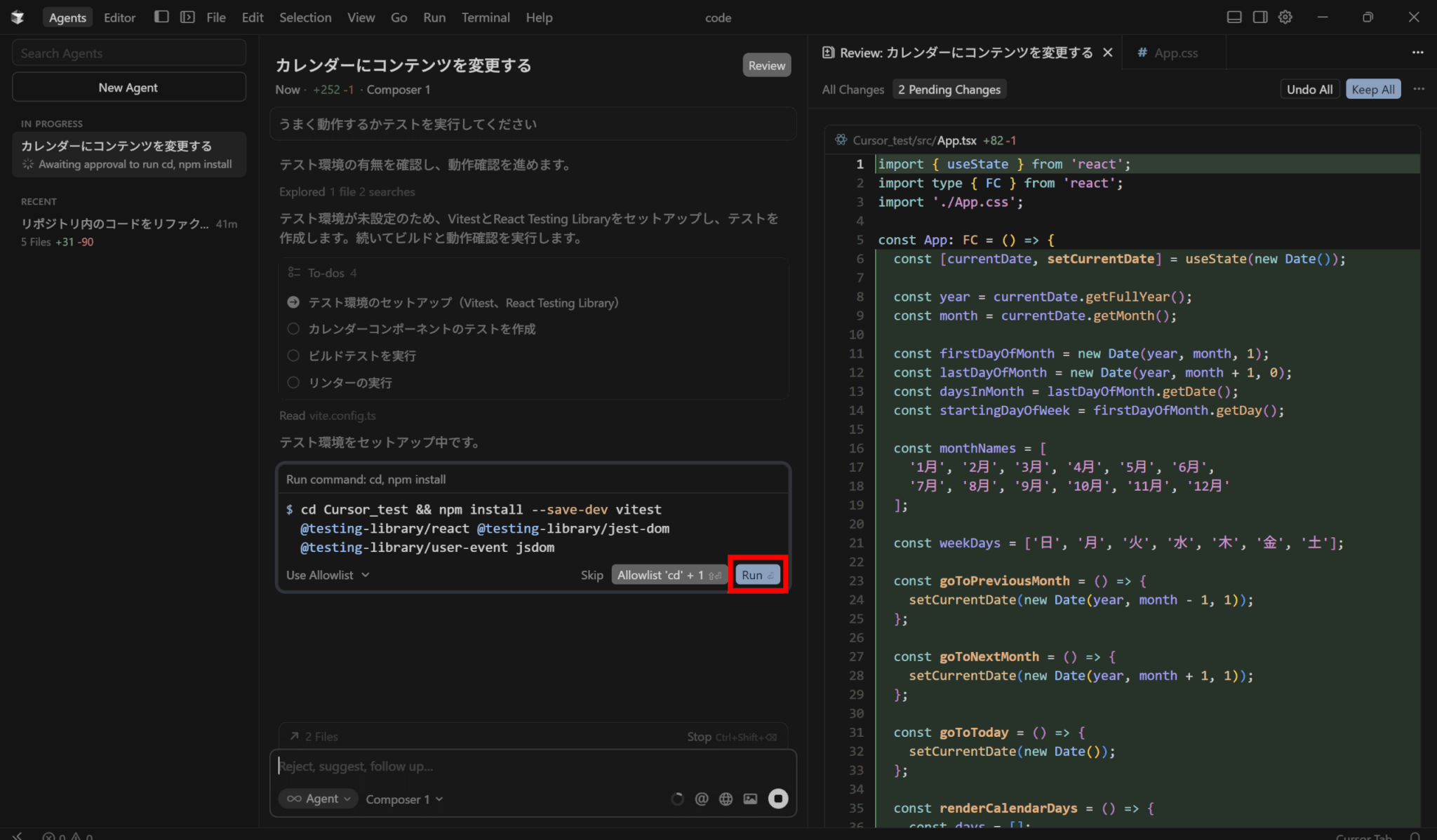 コードに問題がないか確認するため、プロンプトでテストの実行を依頼しましょう。