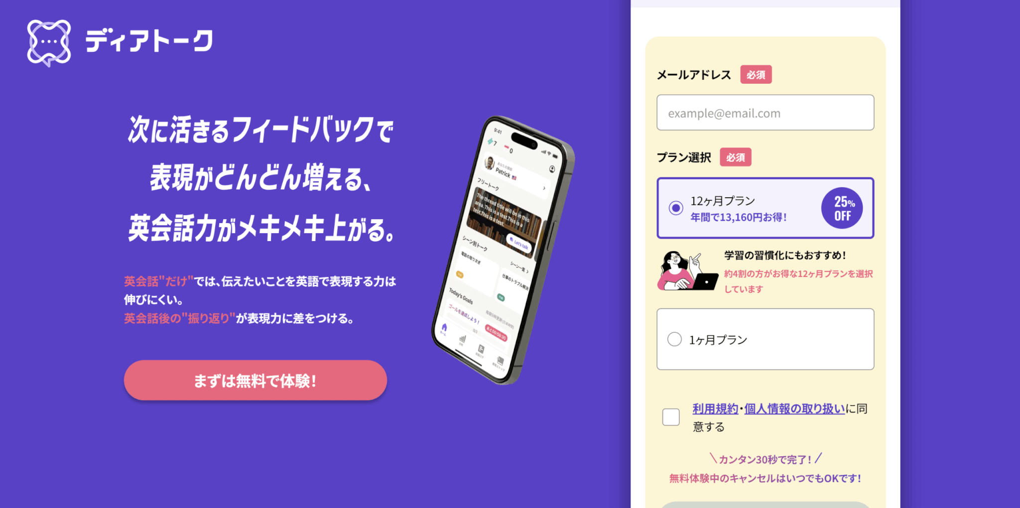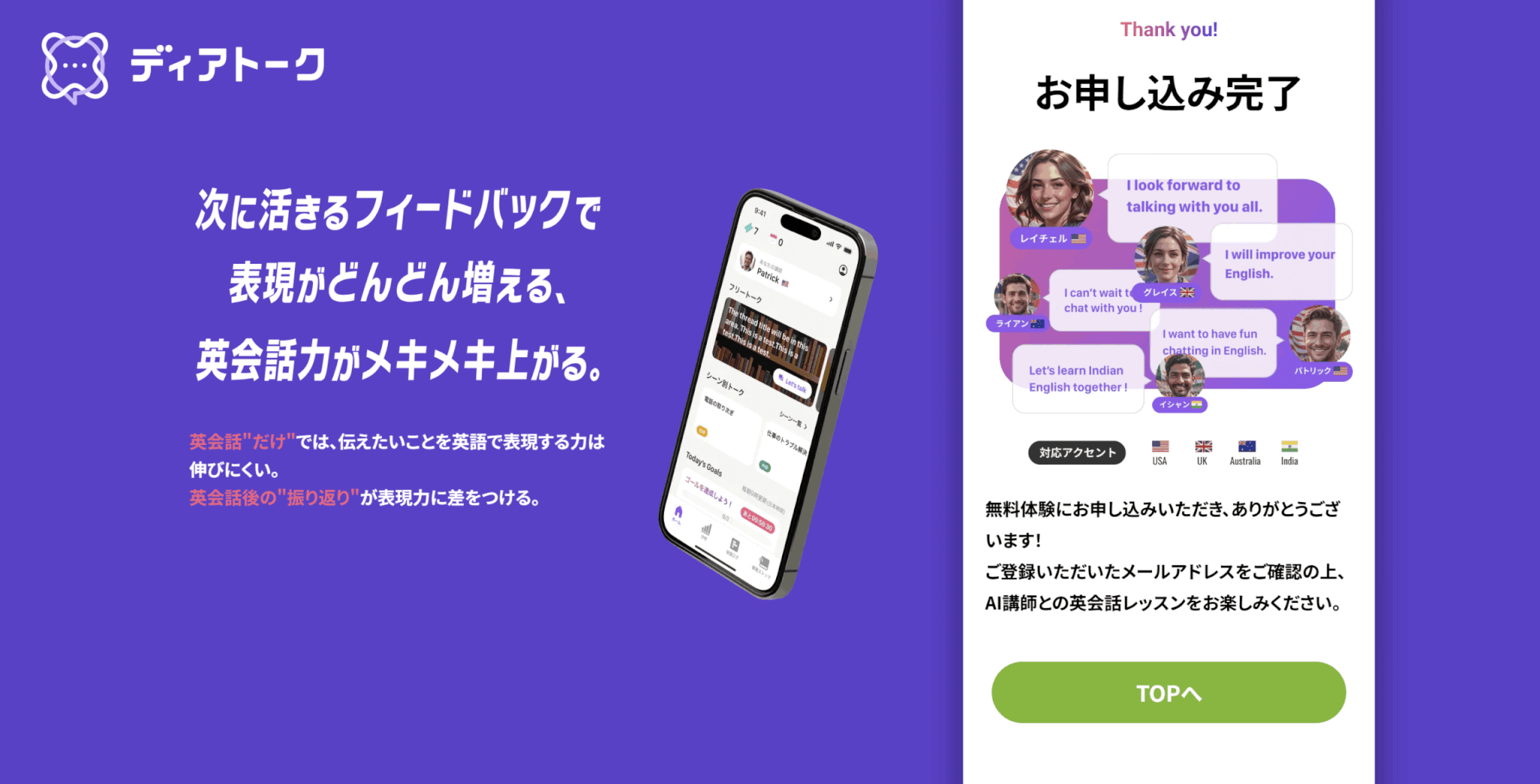 ある程度知識はあるものの、実際の会話ではうまく話せないという悩みであれば、ディアトークの実践形式での会話が効果的です。AIとの実戦形式の会話練習と、文脈に基づく詳細なフィードバックにより、会話で使える自然な表現が身につきます。