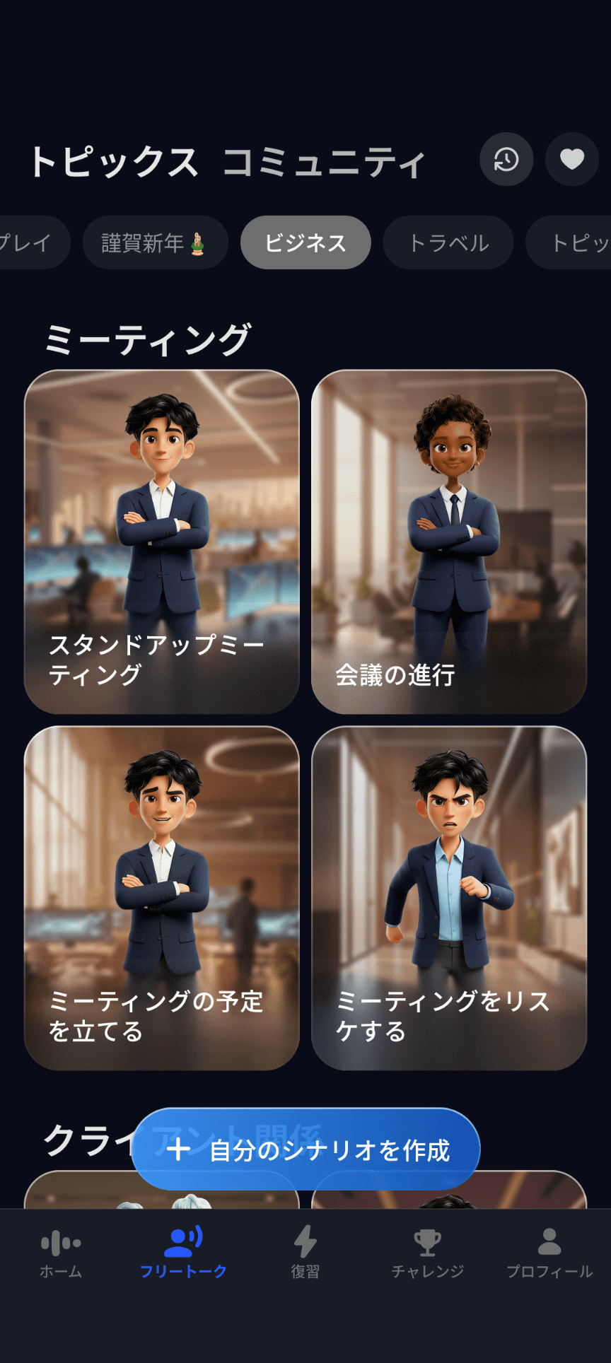 一方スピークにもビジネス向けのロールプレイシナリオがあり、さまざまな場面での会話を学べます。