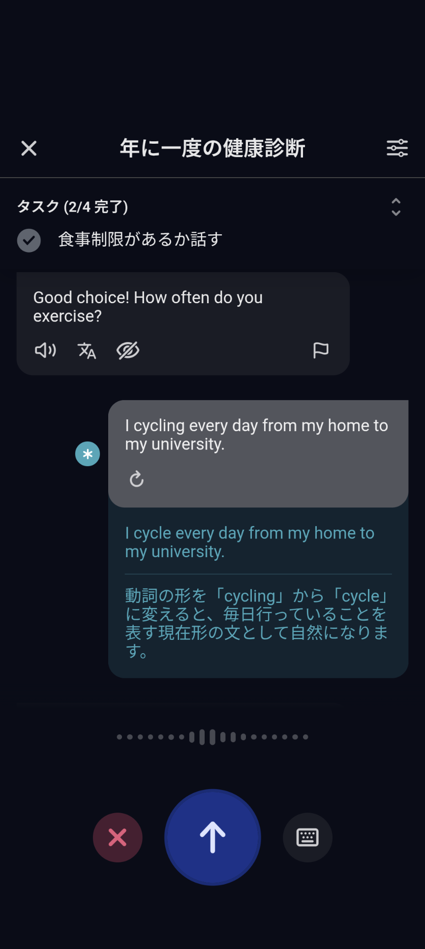 | AI添削 | 会話終了後に詳細フィードバック | 会話中にその場で即時フィードバック |