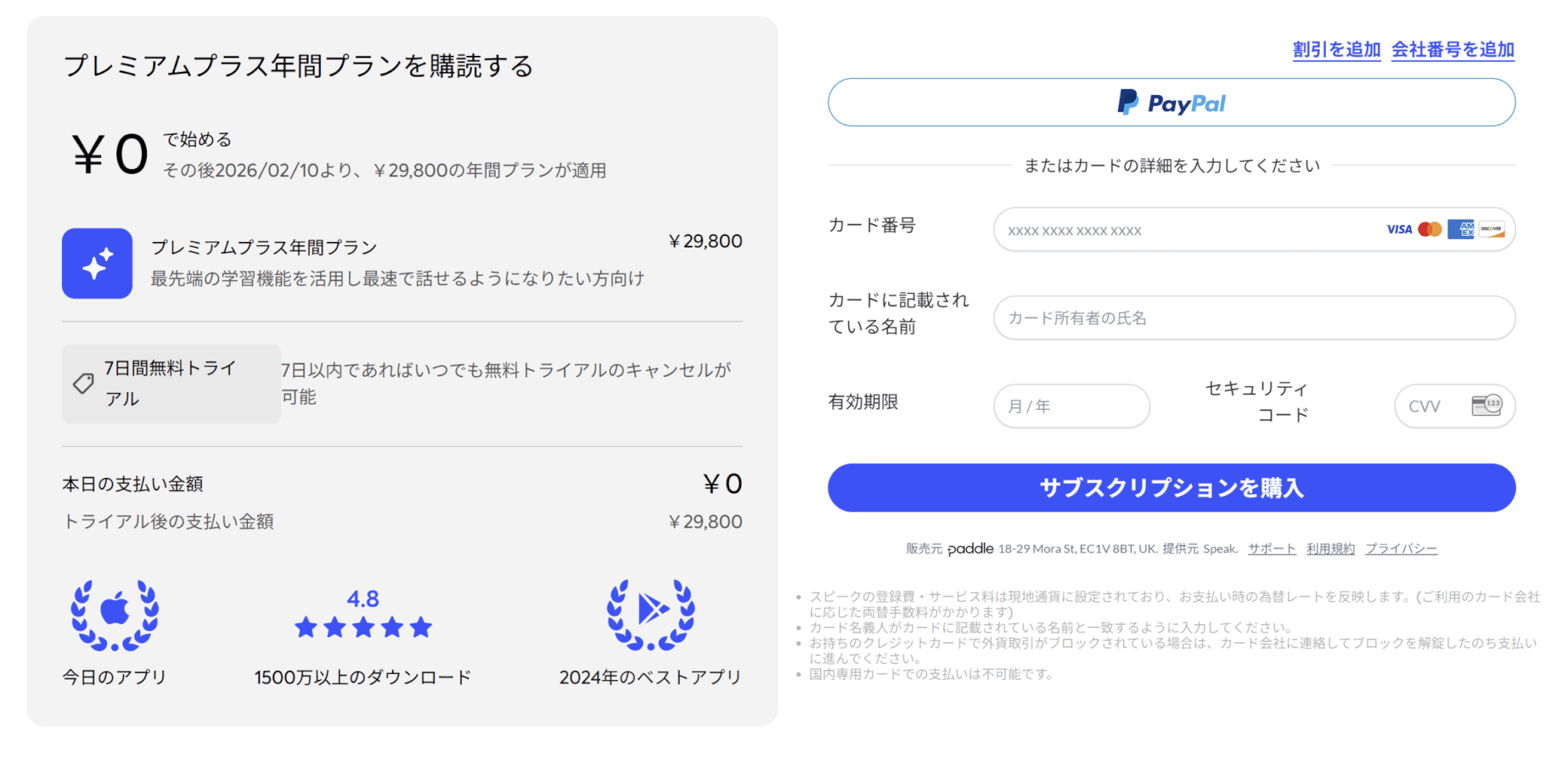 支払い方法としては、Web購入の場合、PayPalかクレジットカードが利用できます。情報を入力して「サブスクリプションを購入」をクリックすることで、無料体験の申し込みが完了します。