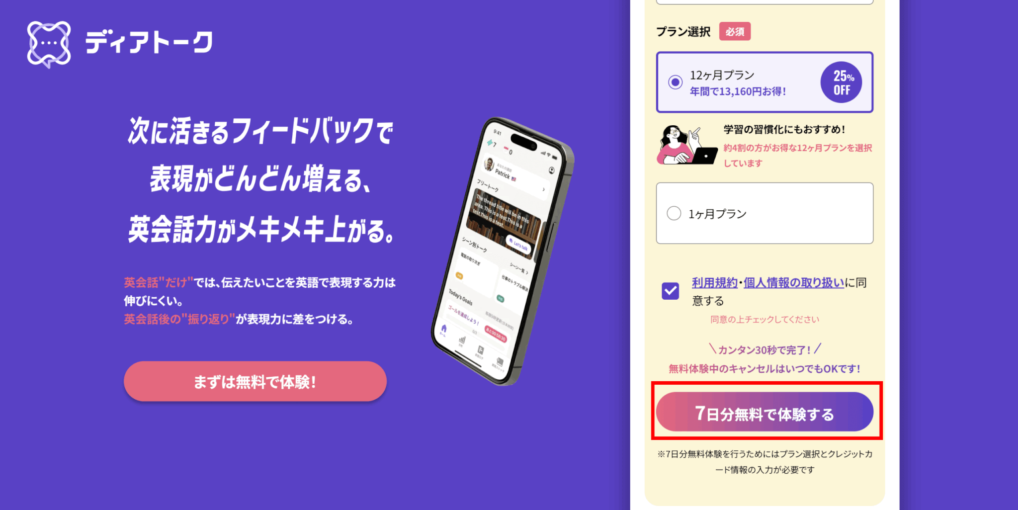 利用規約と個人情報の取扱いに同意し、「7日分無料で体験する」をクリックします。