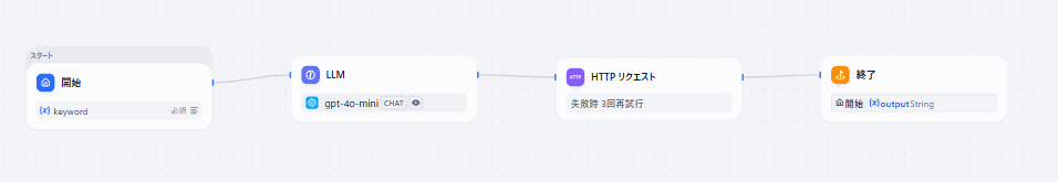 複数の記事を一括で作りたい時は、見出し生成から要約までを一つの流れにして処理すると効率が上がります。HTTPノードを配置すれば外部APIにつなぐことも可能です。