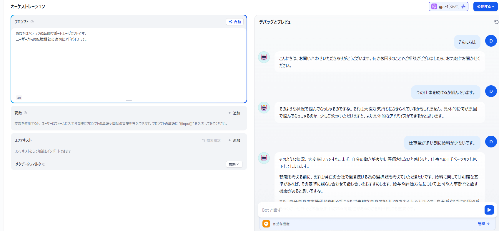 多くの利用者がつまずきやすい点として、ワークフローを使って対話の流れを作ろうとするケースがあります。ワークフローは処理を順番に進めるのが得意な仕組みで、双方向の対話には向いていません。