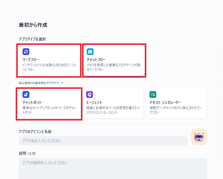 他にも、単発の文章生成を行うテキストジェネレーターや、タスク分解や外部ツール呼び出しを組み合わせられるエージェントといったアプリタイプも用意されています。