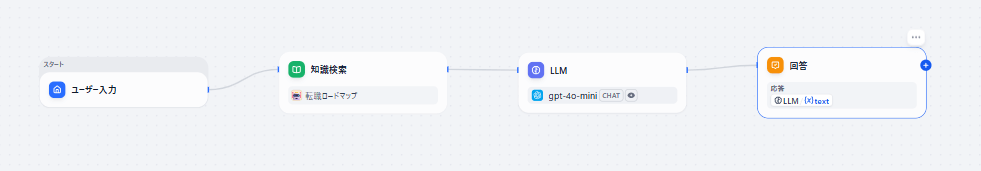 例えば、質問分類のノードで意図を分け、知識検索(RAG)のノードで資料を探し、LLMノードで回答を作ります。案内の途中で追加質問を聞く流れも、ノードを並べるだけで作れます。