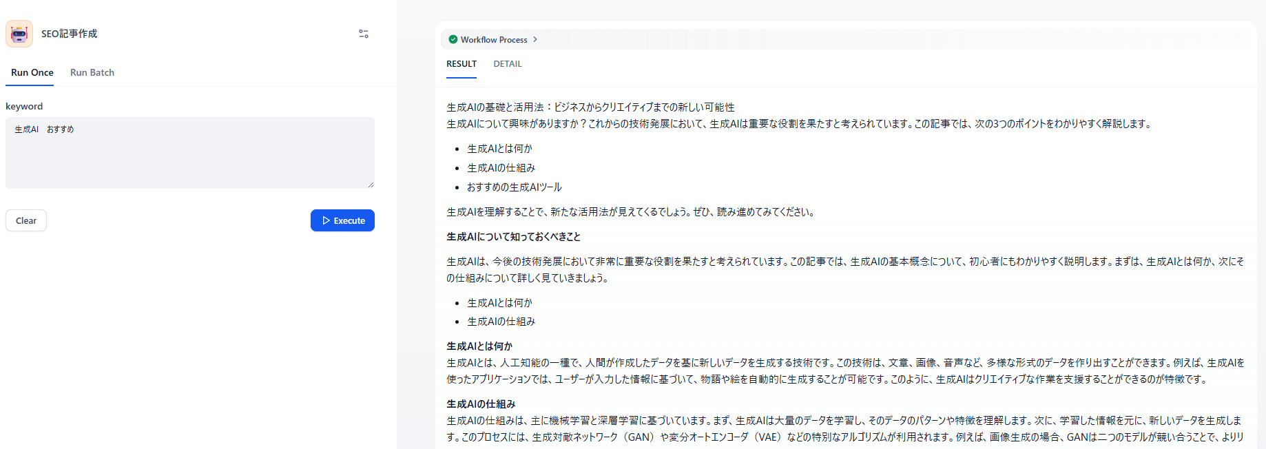 ブログ記事の大量生成などでは、ワークフローを使うと作業負担が下がる場合があります。タイトル生成、構成案