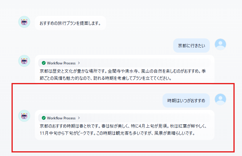 例として、ユーザーが「京都に行きたい」と入力した場面では、京都の情報をメモリに保存し、次の質問で関連内容を提示します。