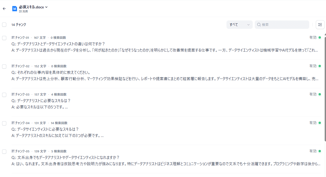 ナレッジのチャンク設定例