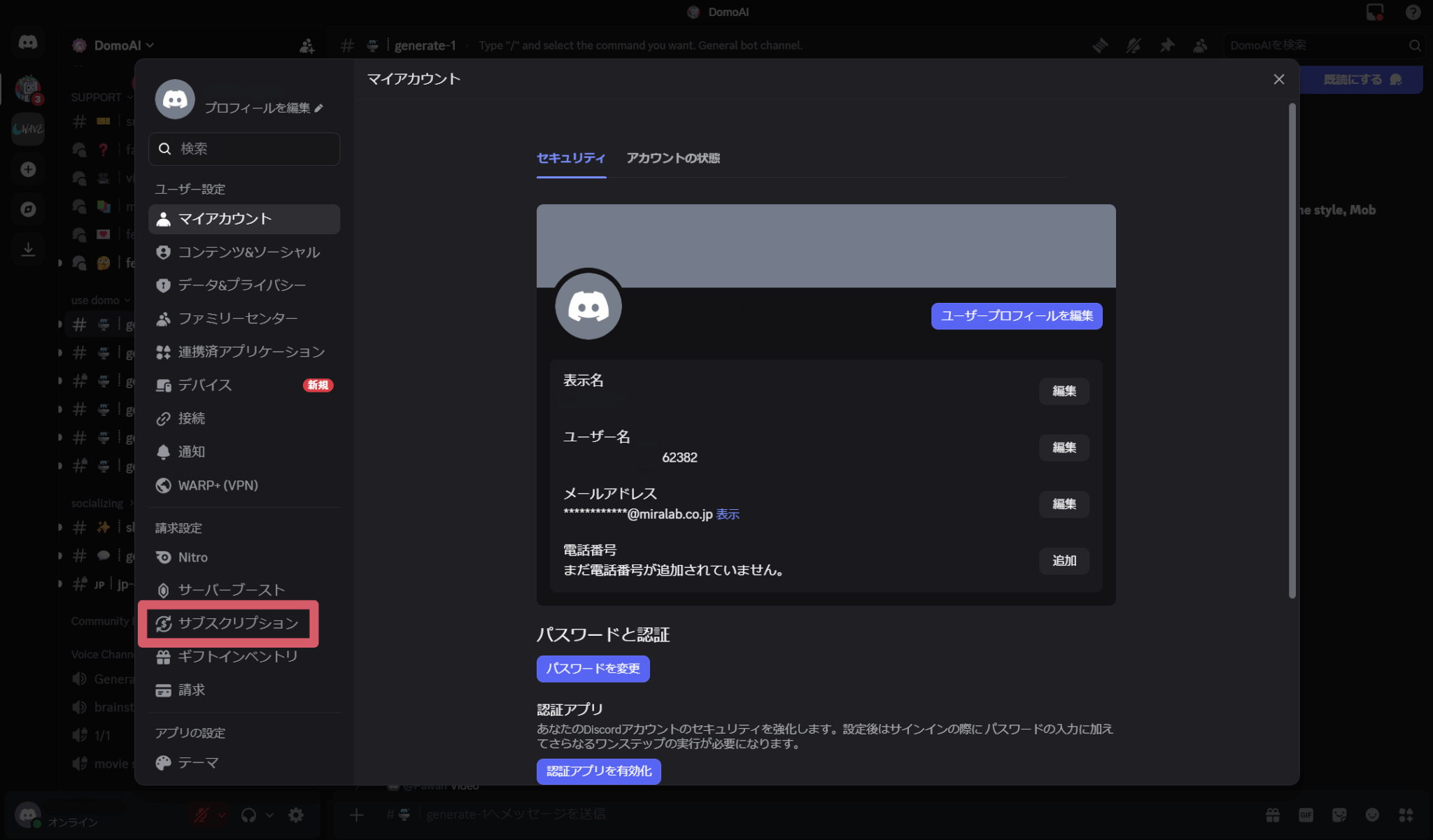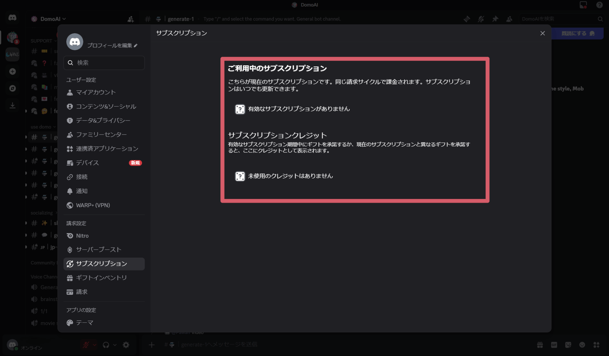 Discordには「サブスクリプション」一覧がありますが、DomoAIの課金は外部決済(Stripe)へ進む形のため、この一覧にDomoAIが表示されないことがあります。