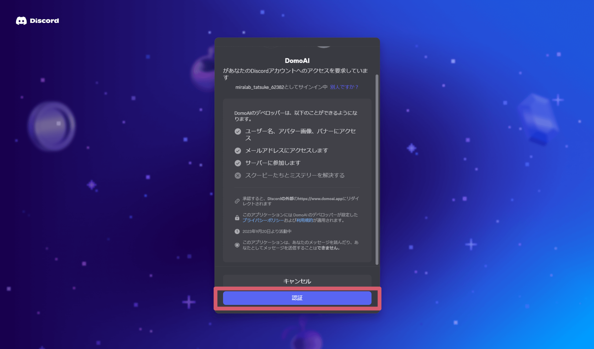 本人確認の画面で「Discordで認証」を実行し、Discordの認可画面で「認証」を押します。