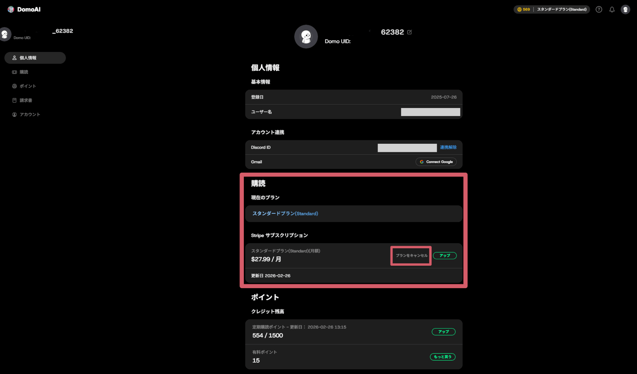 Discord経由で有料化している場合は、ボットの案内(コマンドやリンク)からStripeの管理画面へ進みやすく、Web版で課金している場合は、DomoAIの購読画面からStripeへ遷移するがスムーズです。