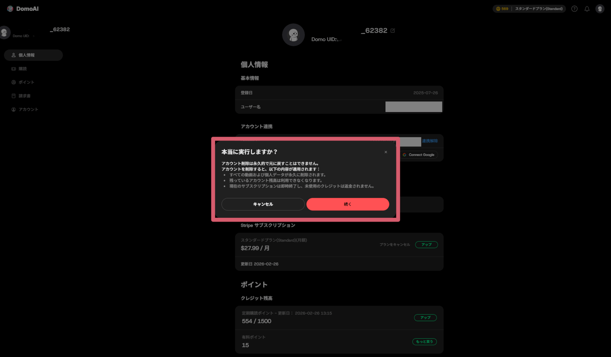 DomoAI画面に戻り、削除に関する確認画面で「続く」を押してください。