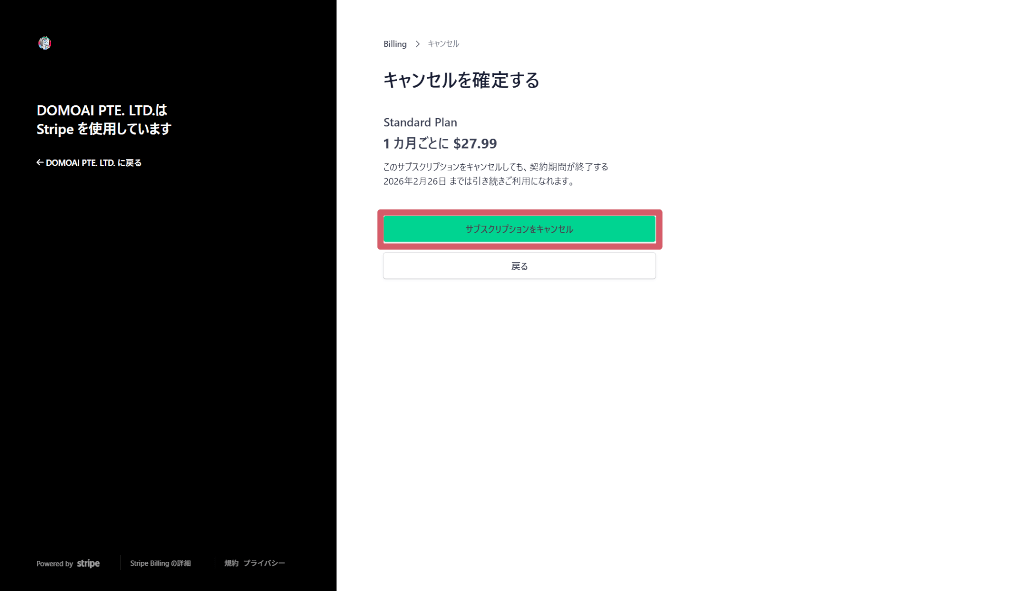 Stripeの画面へ遷移するので、「サブスクリプションをキャンセル」をクリックします。