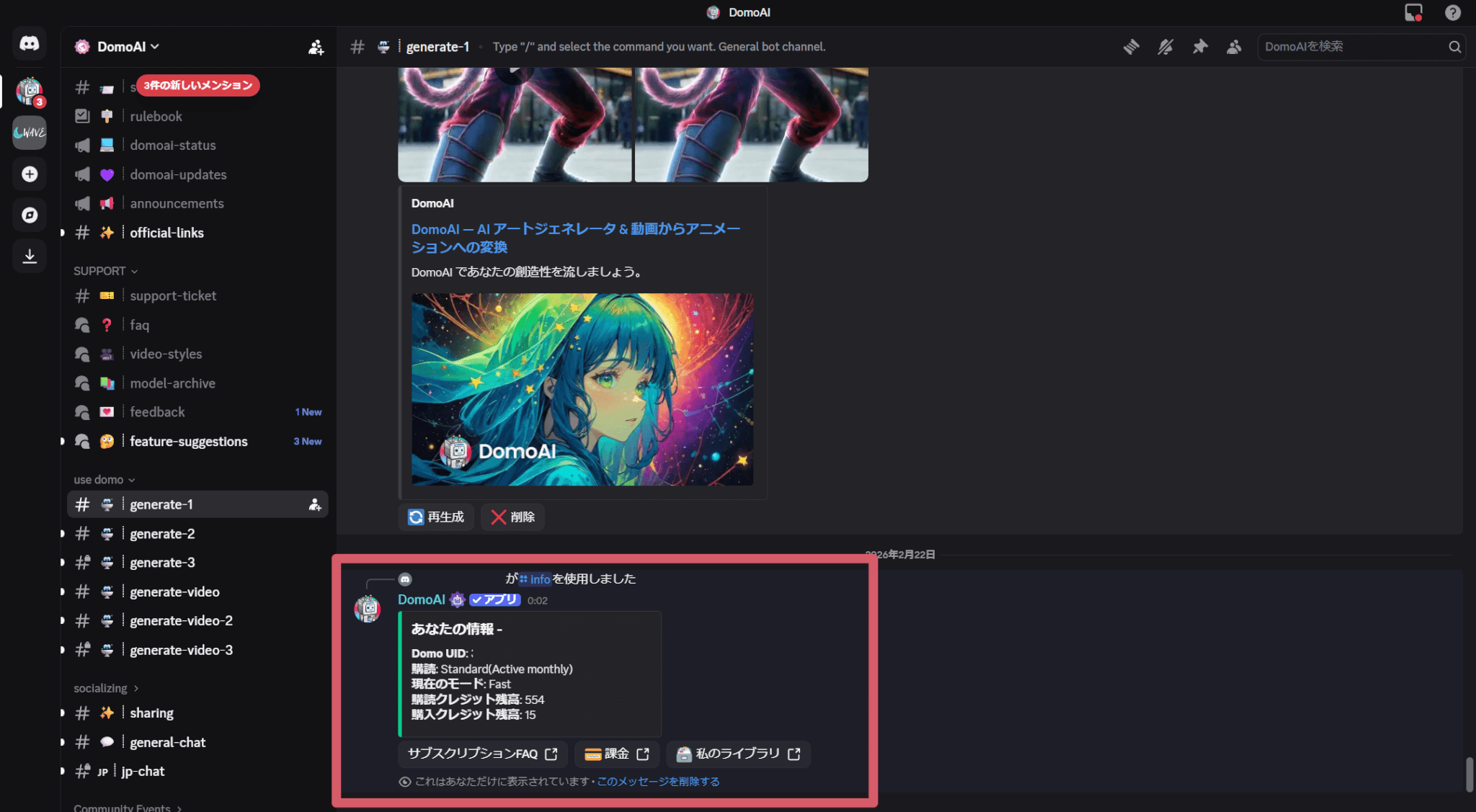 Discord版の場合は「/info」と入力するとプランとクレジットが表示されます。