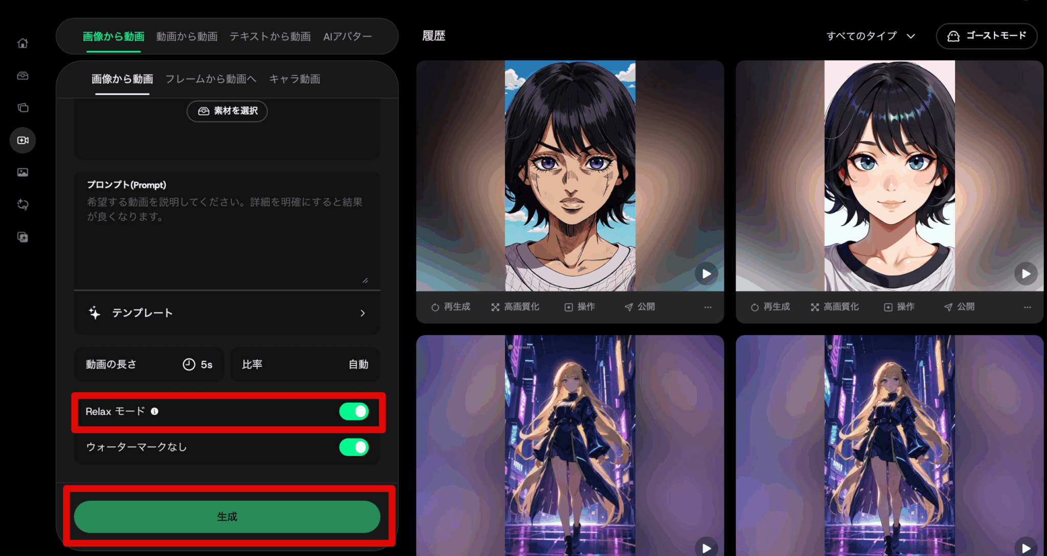 テキストから動画、画像から動画、動画から動画、すべて同じ方法でリラックスモードに切り替えられます。