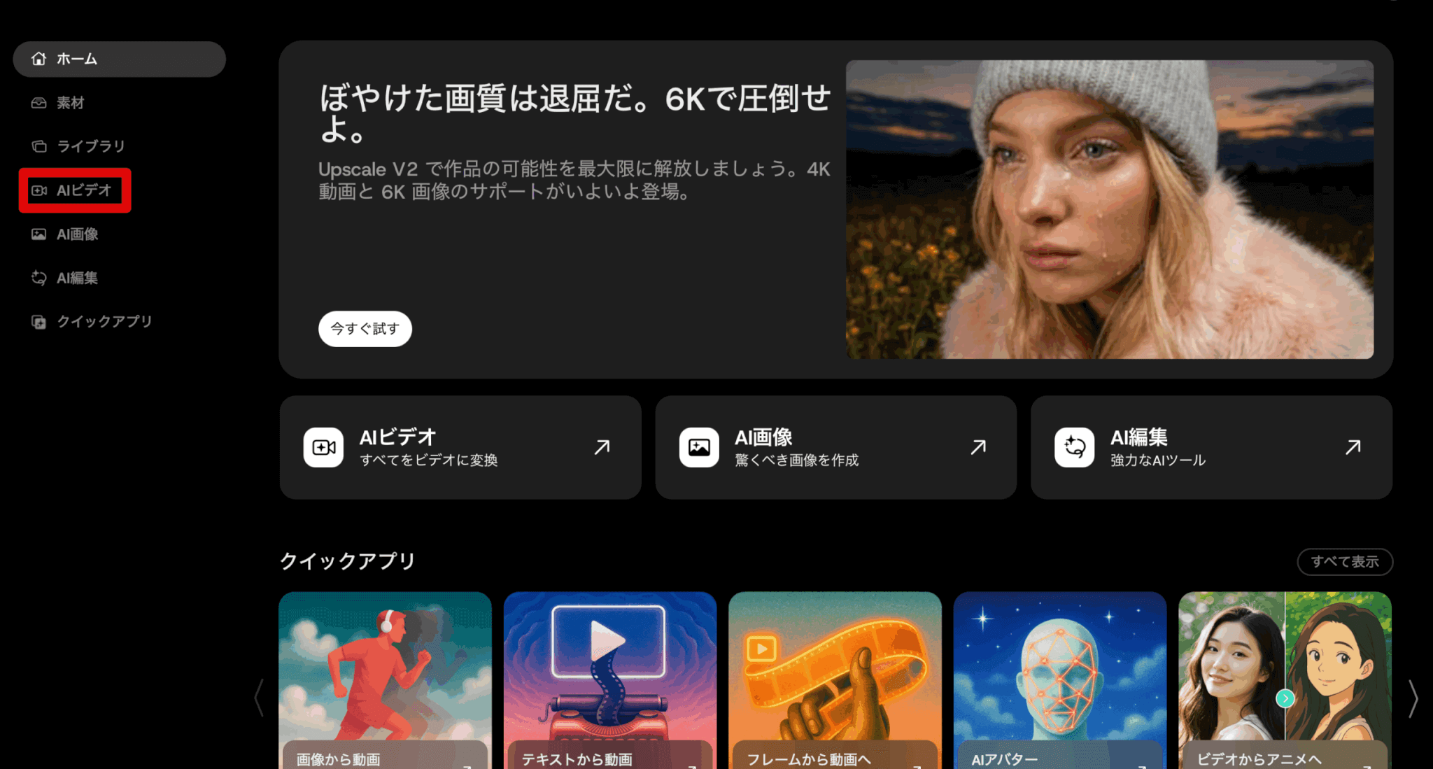 まずはDomoAIにログインして「AIビデオ」をクリックしてください。