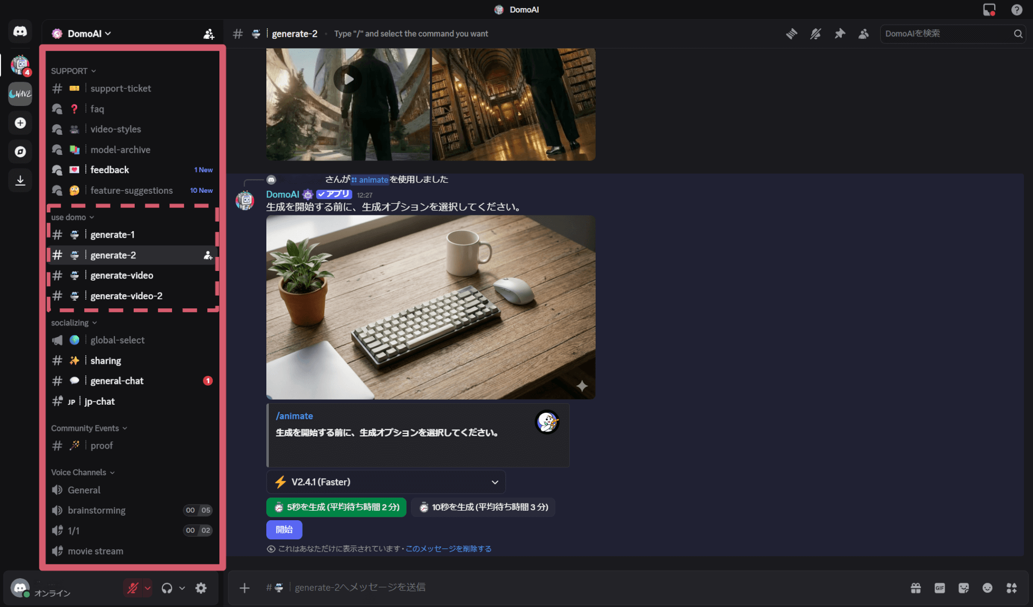 左側のサイドバーにある「generate○○」というチャンネルを開くと生成画面に行けます。