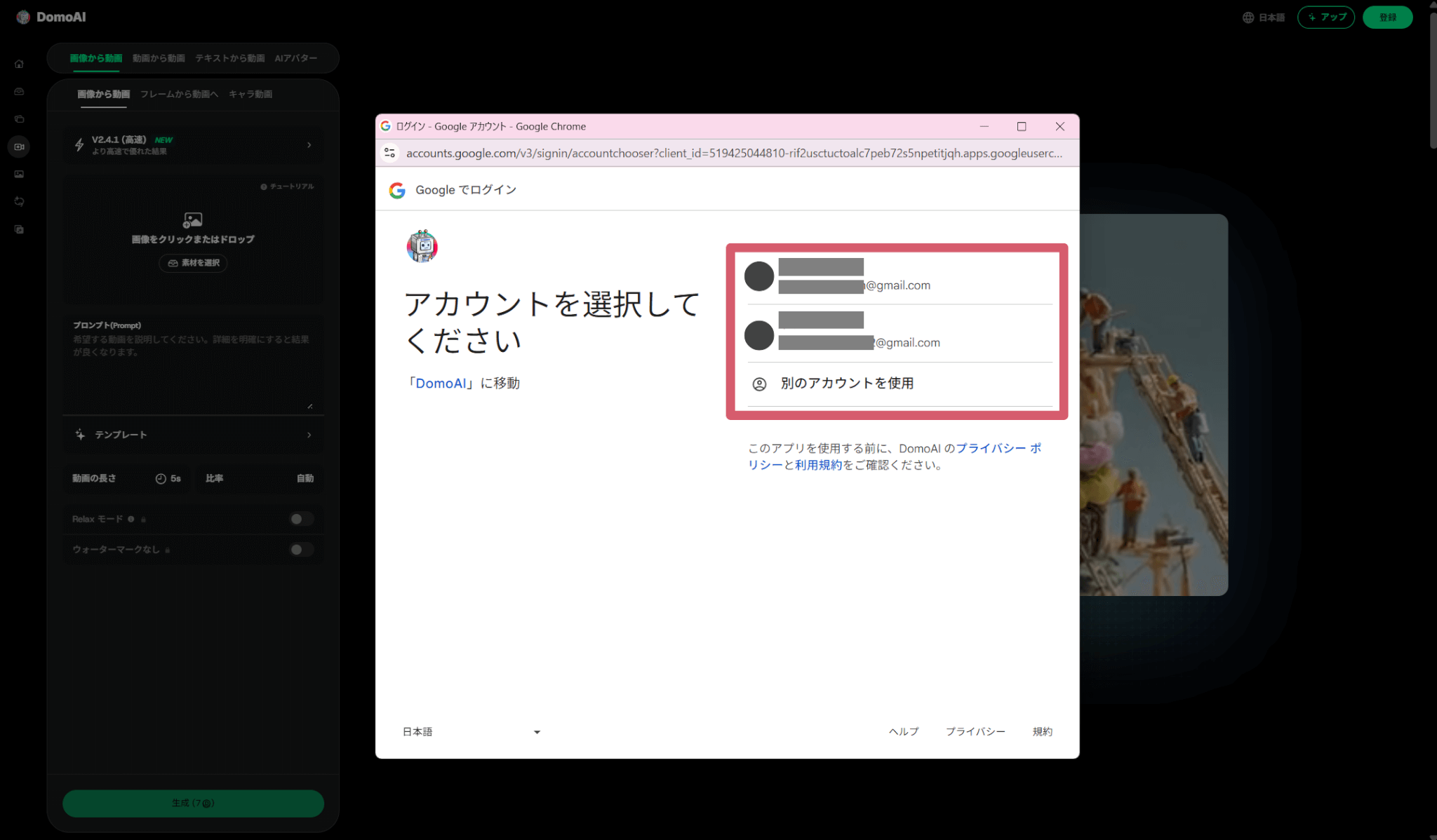 DiscordかGoogleでログインが選択できるのでGoogleを選択し、アカウントを選んでログインします。